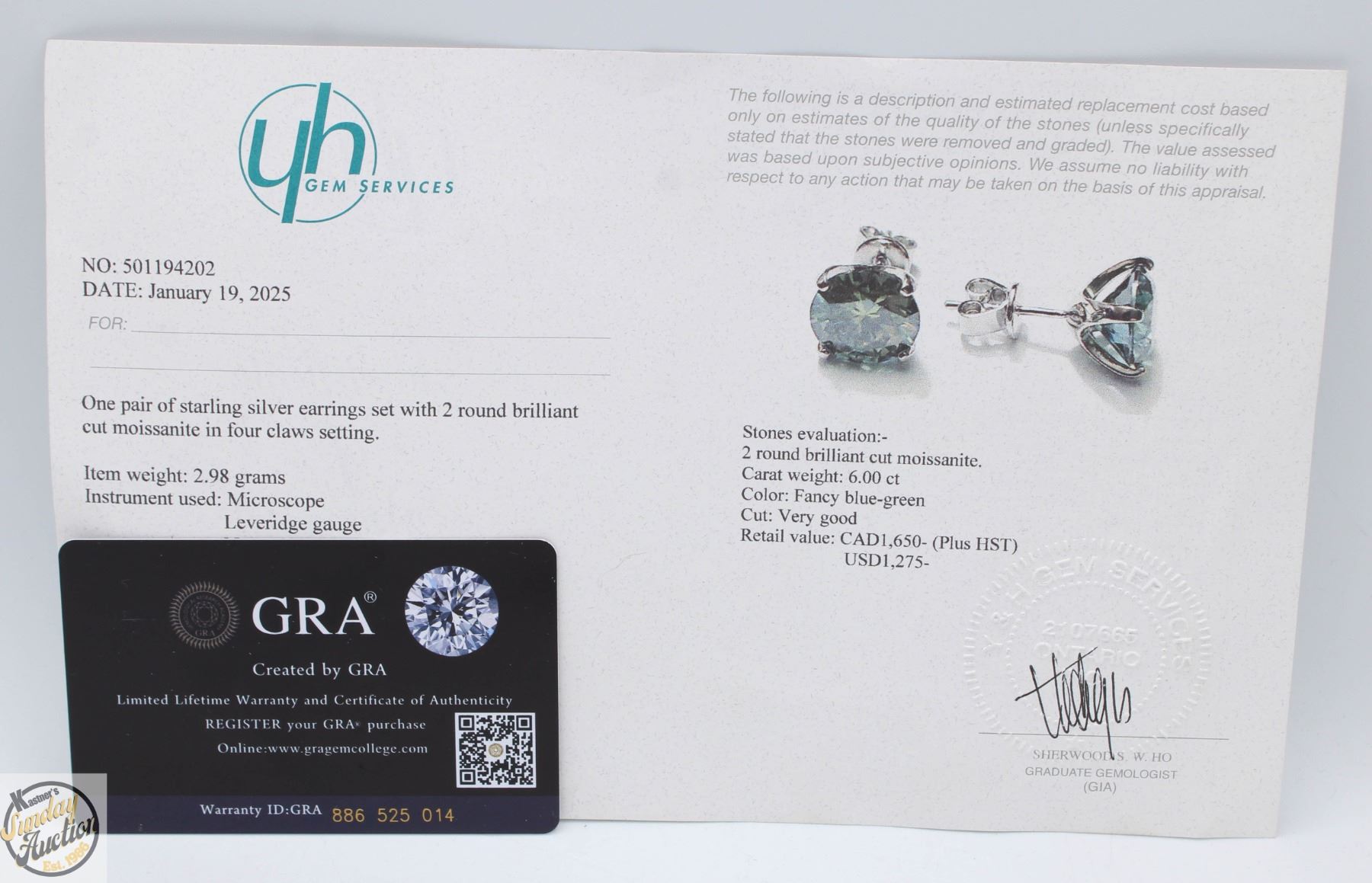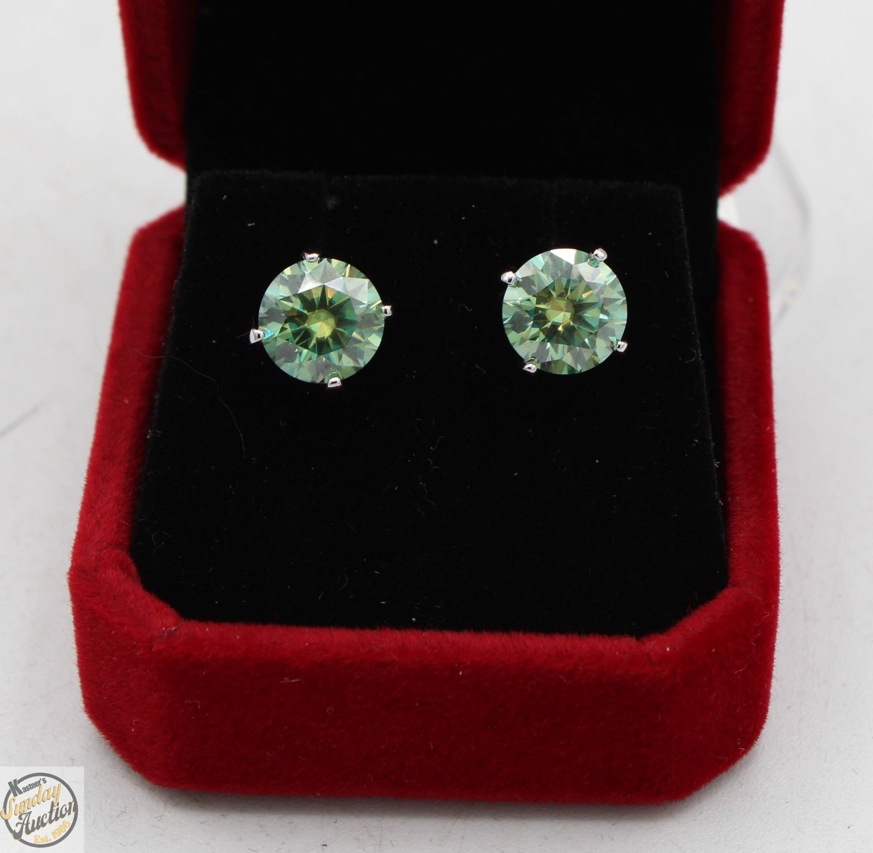 MOISSANITE STONES VVS FANCY BLUE-GREEN COLOR SET IN 4 CLAW HEAD SET IN 925 SILVER EARRINGS RETAIL VALUE $1,650.00 **ALL ITEMS MUST BE REMOVED BY 5PM SATURDAY, JUNE 28th 2025. ALL REMAINING ITEMS WILL BE SUBJECT TO A $6.00 PER DAY STORAGE CHARGE. ANY ITEMS REMAINING AFTER MONDAY, JULY 14TH 2025 WILL BE CONSIDERED FORFEITED. NO REFUNDS WILL BE ISSUED FOR FORFEITED ITEMS. TO SCHEDULE A PICK UP APPOINTMENT CLICK HERE