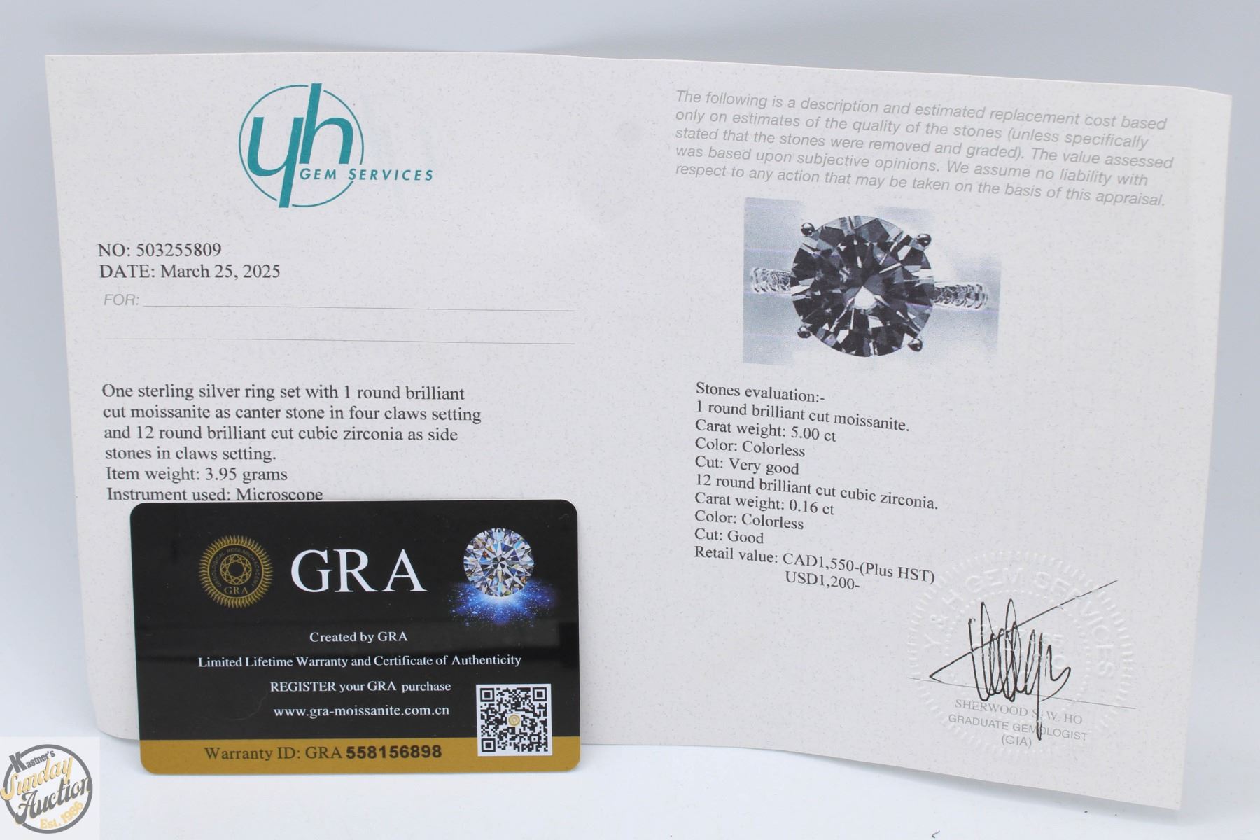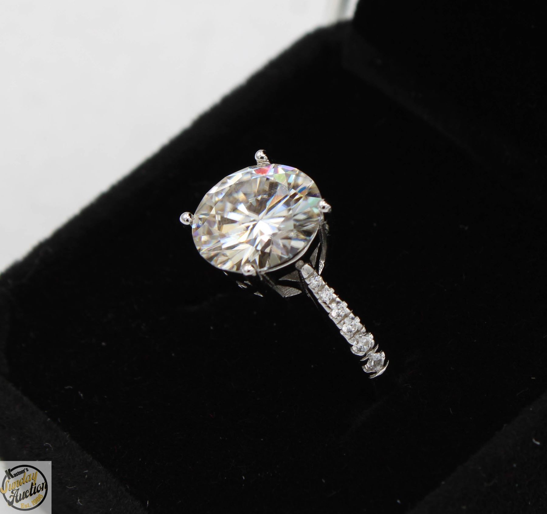 MOISSANITE STONE VVS D COLOR SET IN CENTER WITH 12 ROUND BRILLIANT CUT CUBIC ZIRCONIA SET IN SHANKS AND SET IN 925 SILVER RING SIZE 7 RETAIL VALUE $1,550.00 **ALL ITEMS MUST BE REMOVED BY 5PM SATURDAY, JUNE 28th 2025. ALL REMAINING ITEMS WILL BE SUBJECT TO A $6.00 PER DAY STORAGE CHARGE. ANY ITEMS REMAINING AFTER MONDAY, JULY 14TH 2025 WILL BE CONSIDERED FORFEITED. NO REFUNDS WILL BE ISSUED FOR FORFEITED ITEMS. TO SCHEDULE A PICK UP APPOINTMENT CLICK HERE