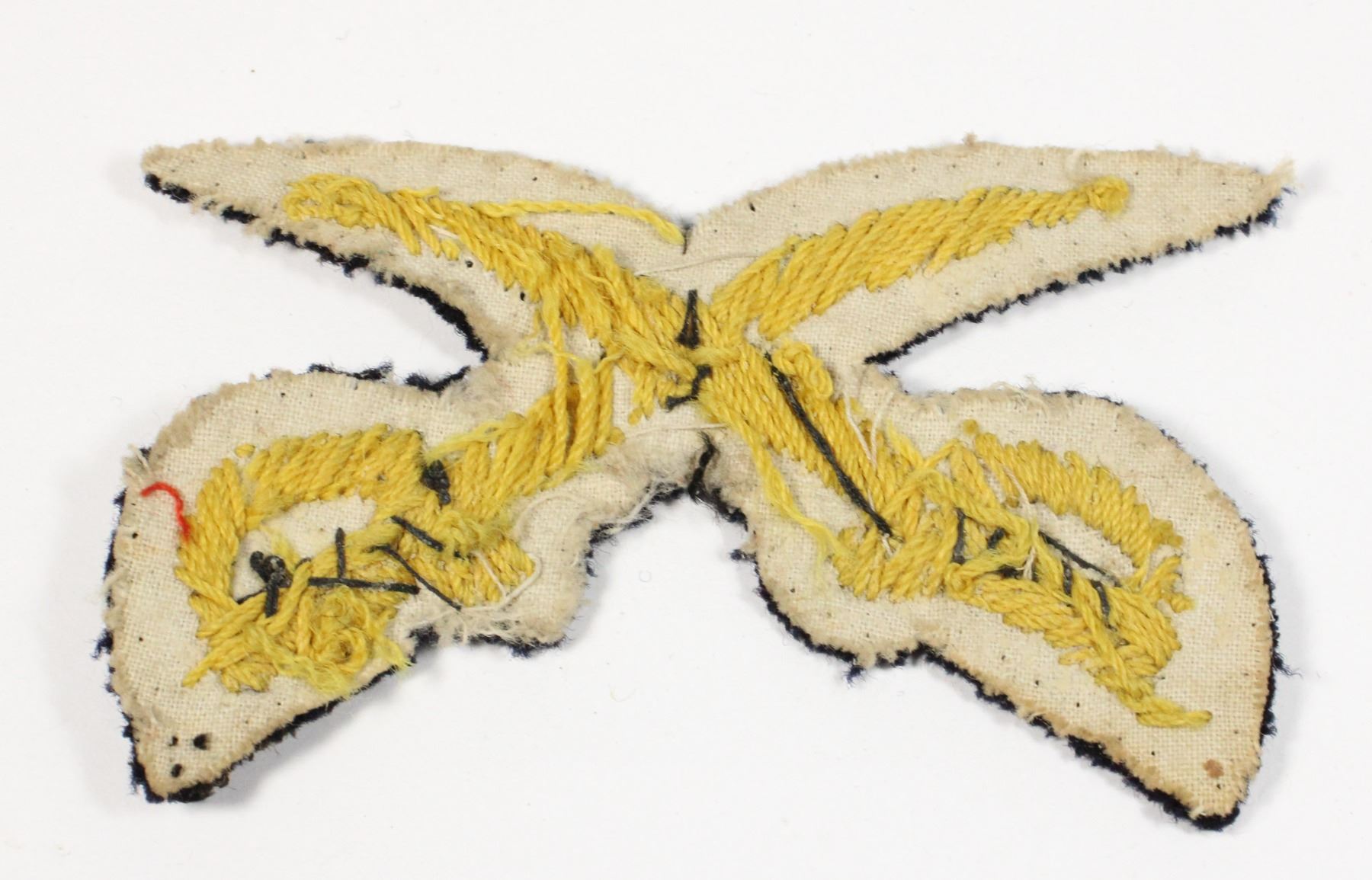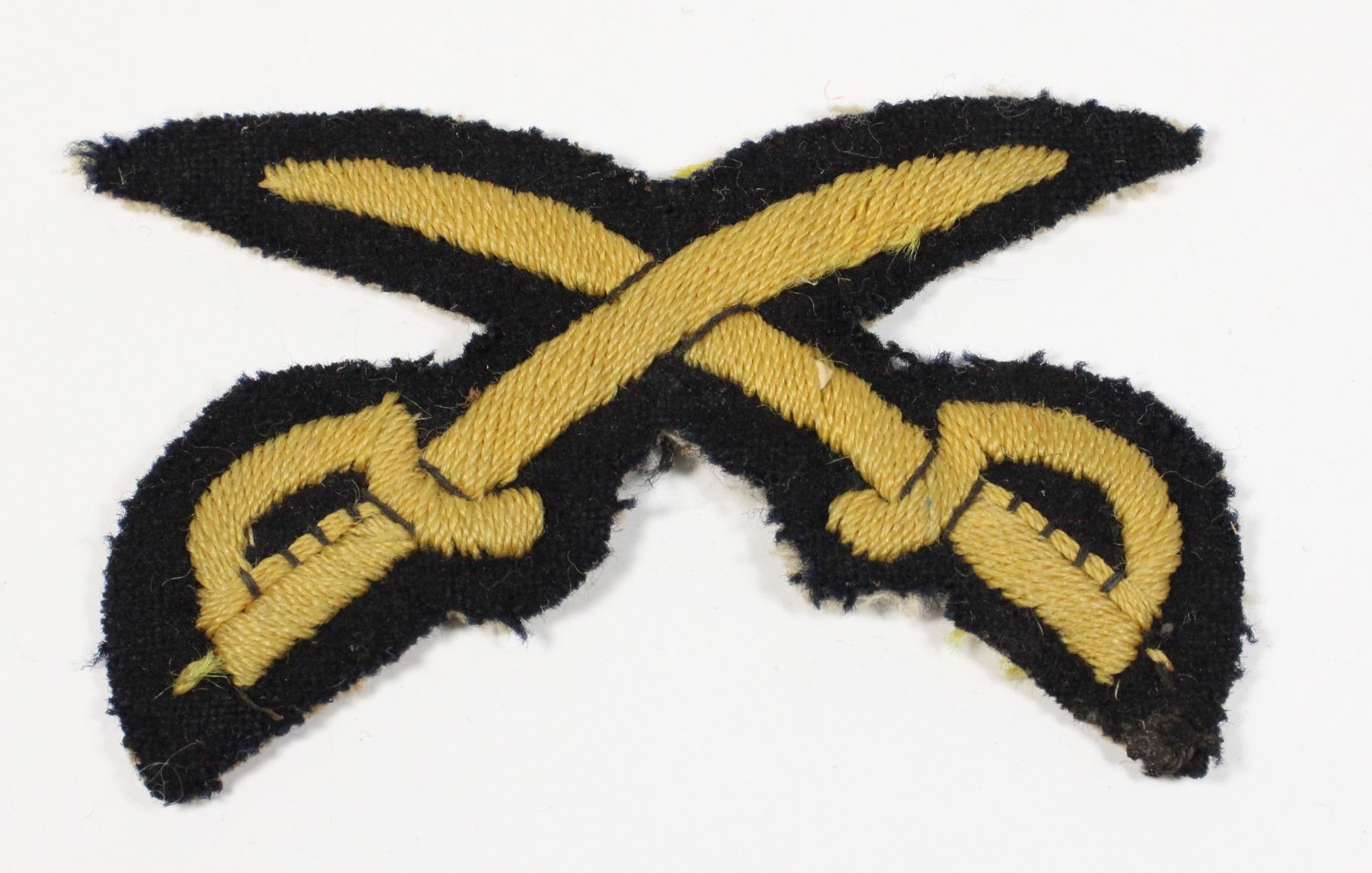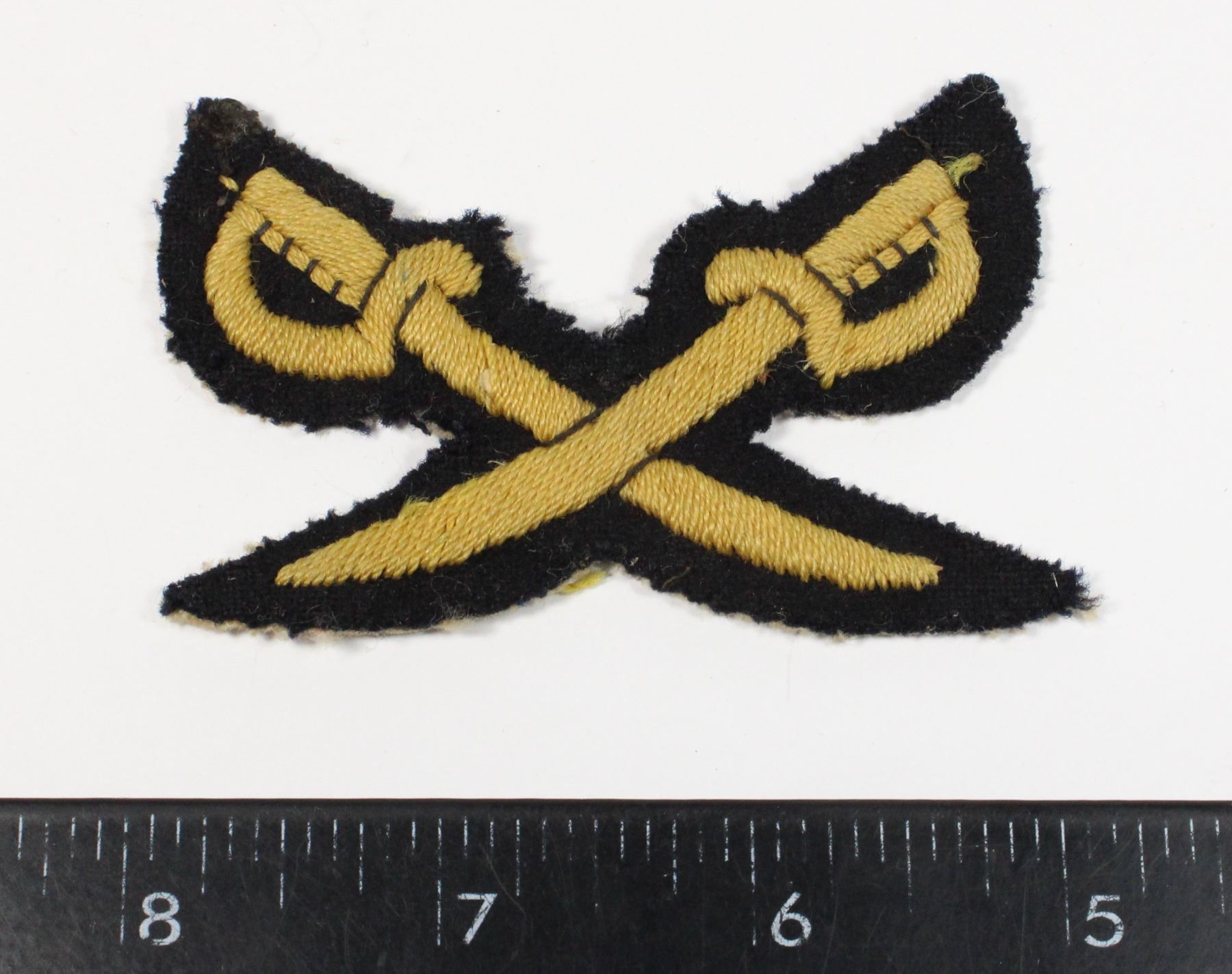 CROSSED SWORD DESIGN, THICK WORSTED YELLOW CLOTH YARD ON BLACK, REVERSE SHOWS SIGNS OF QUALITY STITCHING. BADGE IS PICTURED ON PAGE 350 IN REFERENCE "INSIGNIA OF THE ROYAL CANADIAN MOUNTED POLICE 1873-1998" BY DONALD J. KLANCHER. BADGE IS DESCRIBED ON PAGE 312
