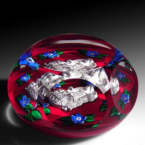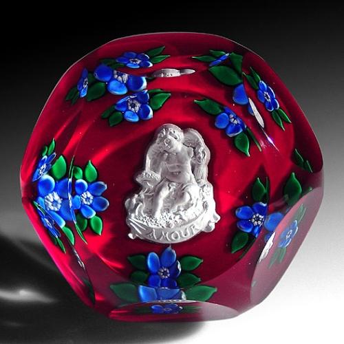 Saint Louis 1979 faceted "Amour" paperweight, containing a sulphide of Cupid, encircled by a spaced garland of blue lampwork flowers, with millefiori centers and green leaves, on rose-colored ground. Six and one facets. Signature/date cane. Limited edition #99 of 400. Diameter 3". Includes collector certificate. NO RESERVE