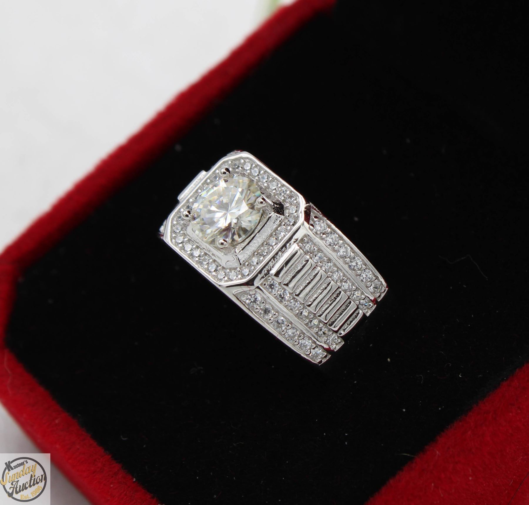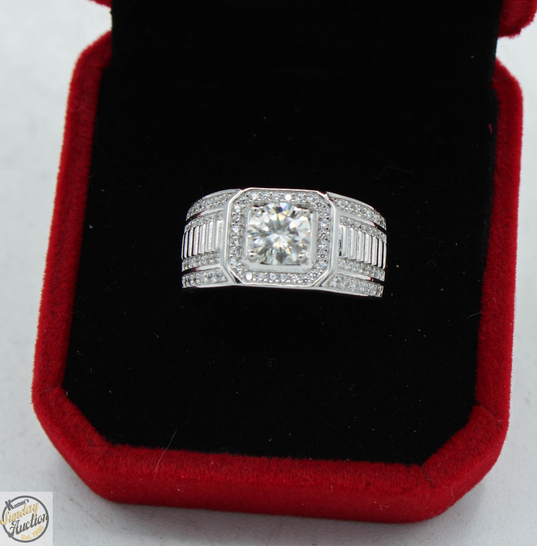 MOISSANITE STONE VVS D COLOR WITH 84 ROUND BRILLIANT CUT CUBIC ZIRCONIA SET IN SQUARE HALO AND SET IN THE SHANKS SET IN 925 SILVER RING SIZE 9 RETAIL VALUE $1,200.00 **ALL ITEMS MUST BE REMOVED BY 5PM SATURDAY, JUNE 28th 2025. ALL REMAINING ITEMS WILL BE SUBJECT TO A $6.00 PER DAY STORAGE CHARGE. ANY ITEMS REMAINING AFTER MONDAY, JULY 14TH 2025 WILL BE CONSIDERED FORFEITED. NO REFUNDS WILL BE ISSUED FOR FORFEITED ITEMS. TO SCHEDULE A PICK UP APPOINTMENT CLICK HERE