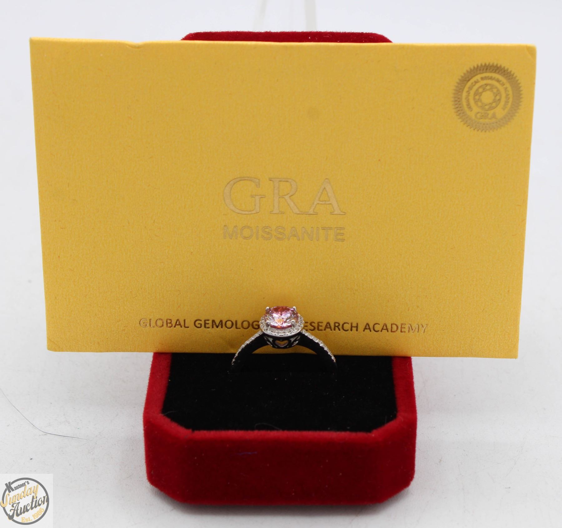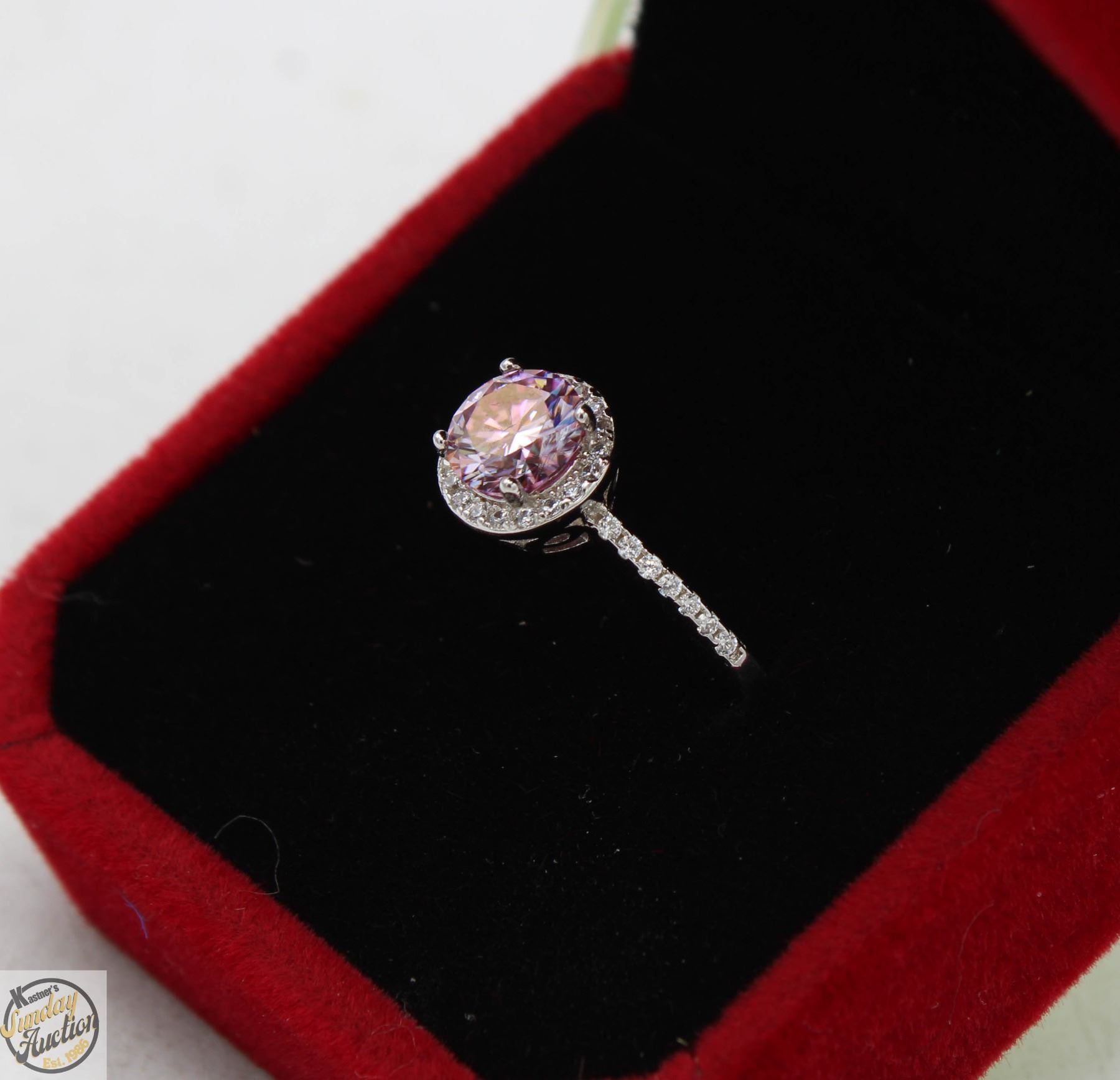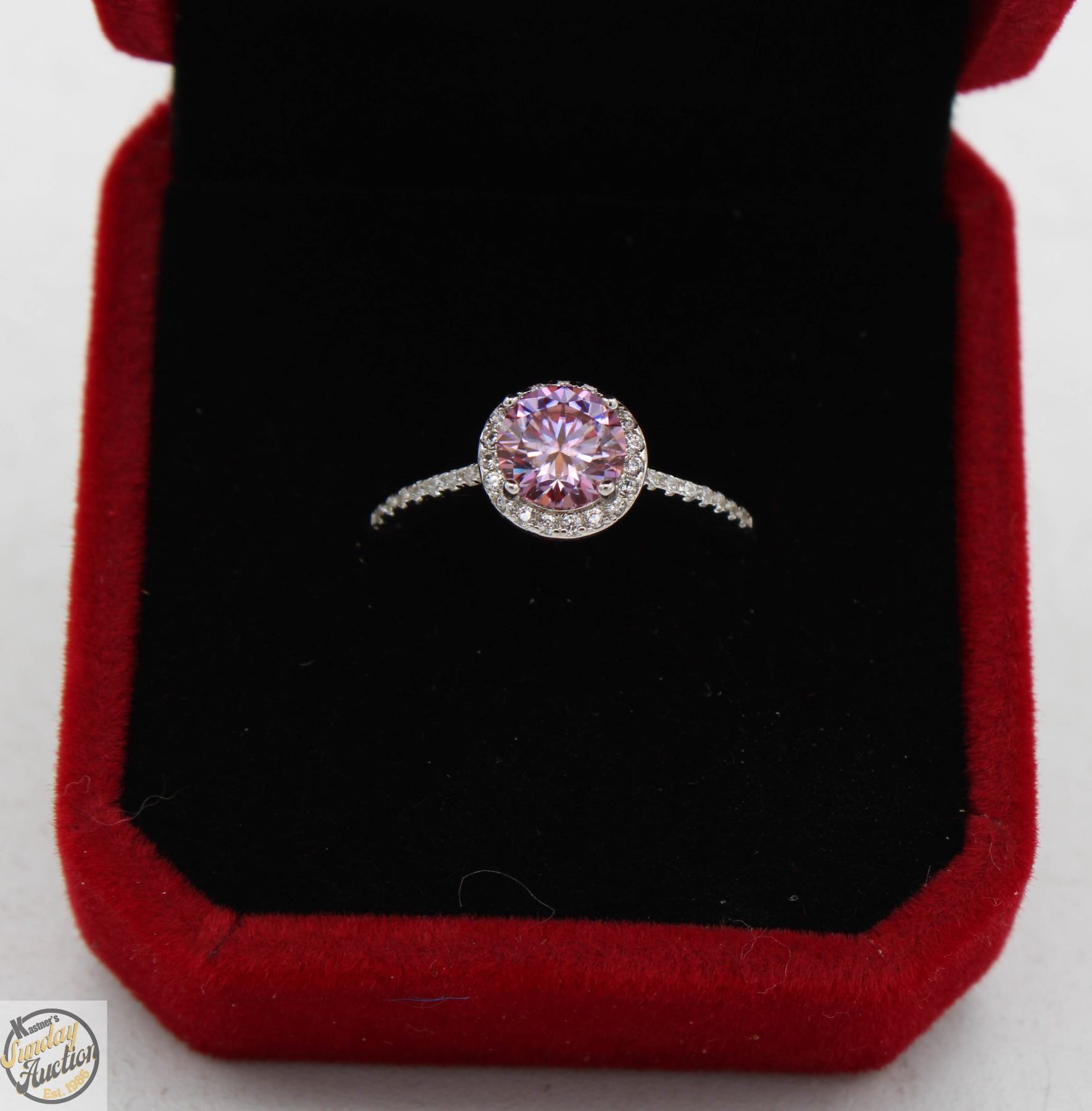 MOISSANITE STONE VVS PINK COLOR WITH 34 ROUND BRILLIANT CUT CUBIC ZIRCONIA SET IN ROUND HALO AND SET IN SHANKS SET IN 925 SILVER RING SIZE 7 **ALL ITEMS MUST BE REMOVED BY 5PM SATURDAY, JUNE 28th 2025. ALL REMAINING ITEMS WILL BE SUBJECT TO A $6.00 PER DAY STORAGE CHARGE. ANY ITEMS REMAINING AFTER MONDAY, JULY 14TH 2025 WILL BE CONSIDERED FORFEITED. NO REFUNDS WILL BE ISSUED FOR FORFEITED ITEMS. TO SCHEDULE A PICK UP APPOINTMENT CLICK HERE