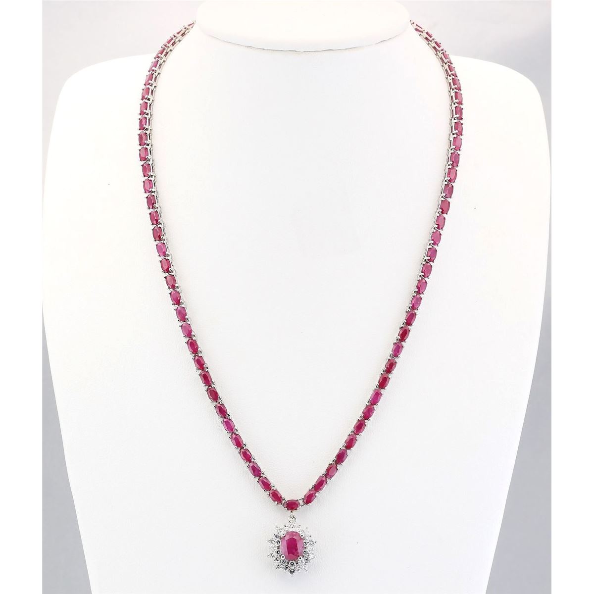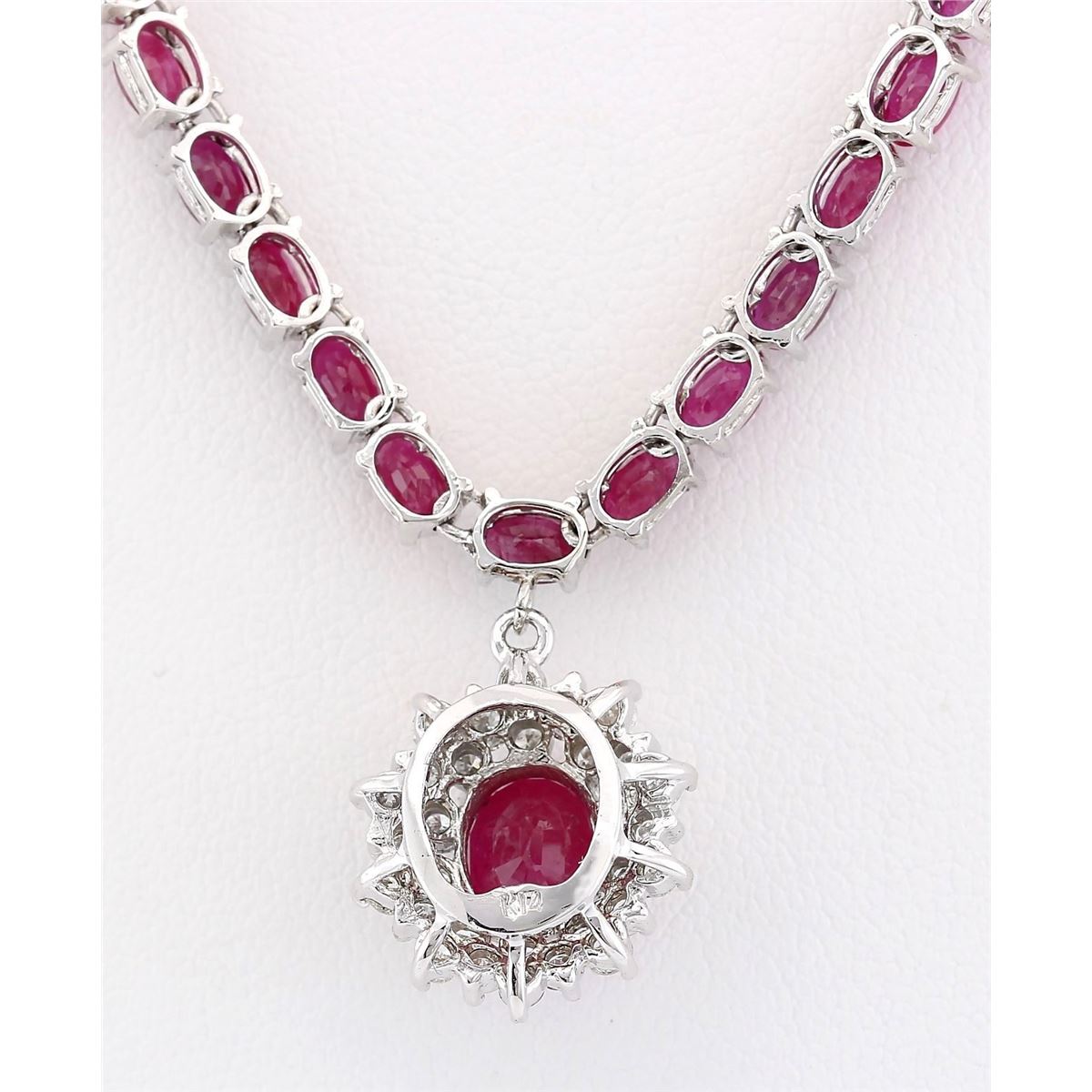 Stamped: 14K Total Necklace Weight: 21.2Grams Diamond Weight: Total natural diamond weight is 1.04carat. SI1-SI2 clarity / G-H color Gemstone Weight: Total Natural Center Ruby Weight is 3.00ctw (Measures: 9.05x7.10) Heated ruby only , no other treatment was done on it . Gemstone Weight: Total Natural Side Ruby Weight is 24.00 Main Stone Color: Red Face Measures: 17.50x15.60mm SKU: [703697]