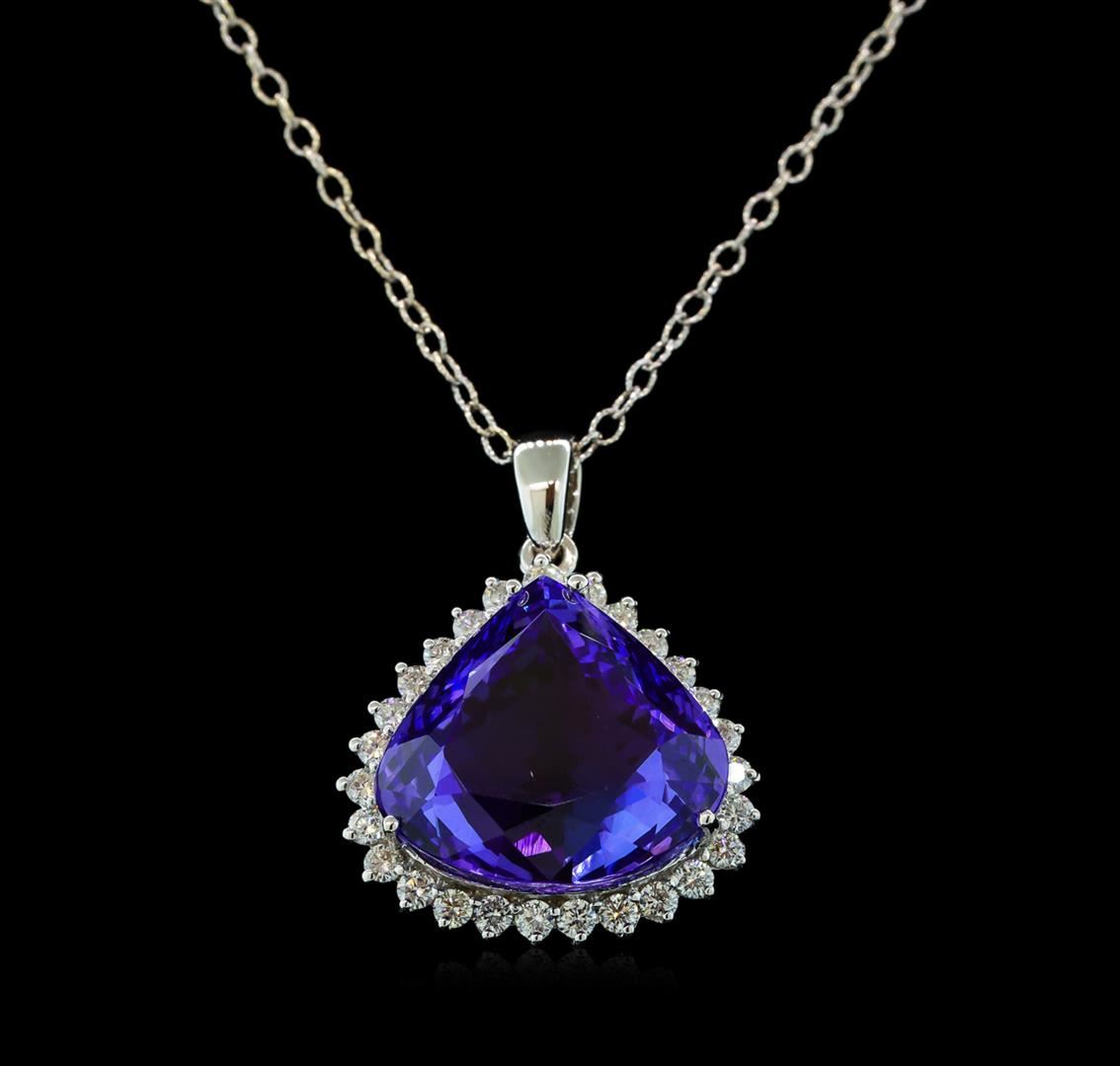 One electronically tested 14KT white gold lady's combination cast & assembled fashion pendant & chain 18.0' long, 1.9mm twisted oval cable link with a lobster claw clasp with a basket halo with a bright polish finish. Identified with markings of '14K'. Condition is new, good workmanship. Containing: One prong set pear modified brilliant cut natural tanzanite, measuring 18.23 x 19.56 x 11.50mm, (depth est.) 2%. bulge factor, approximate weight of 28.05ct., clarity is eye clean, medium, moderately strong, violet color, (GIA V 5/4), cut is good. Transmitting light with no distortion, transparent. Colored gemstones are presumed to have been subjected to commonly used enhancement processes. Graded loose prior to setting in the GIA Laboratory, Report #1176668781. Twenty-Seven prong set round brilliant cut diamonds, measuring 2.25 - 2.15 x 1.34mm (depth est.) approximate total weight of 27 Stones = 1.07ct. Graded in the setting. Clarity SI-1 to SI-2. Color: G - I Cut Good. Total Weight of Colored Stones 28.05ct.. Total Weight of Diamonds 1.07ct.. Total Weight of Pendant & Chain 13.60gm GAS Appraised at $30,930.00.