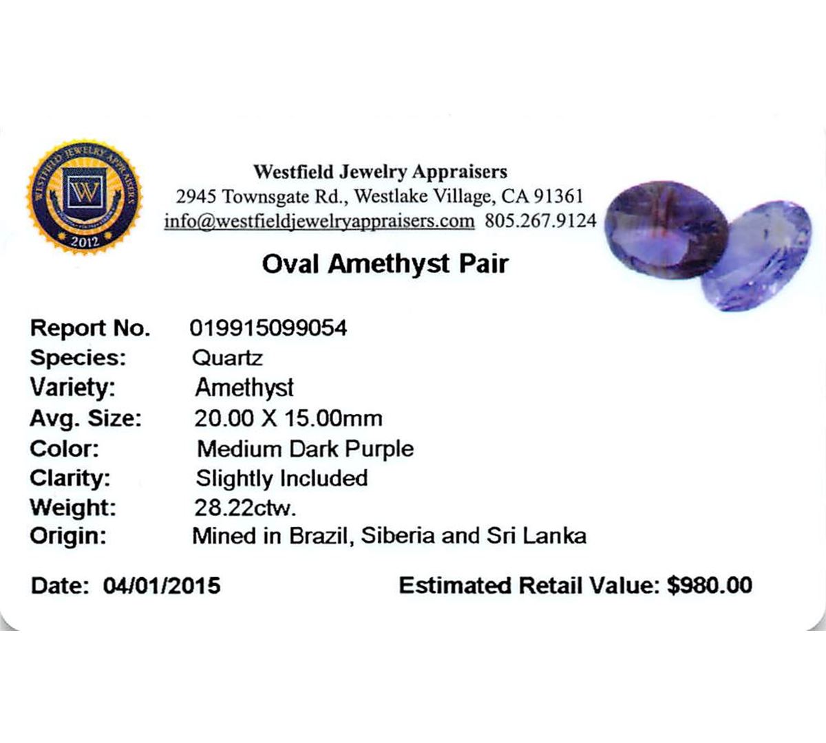 Two oval mixed cut natural amethysts exact total weight 28.22ct., clarity is slightly included, type II, medium dark, very slightly grayish, purple color, (GIA P 6/3), cut is good. Westfield Appraised at $980.00.