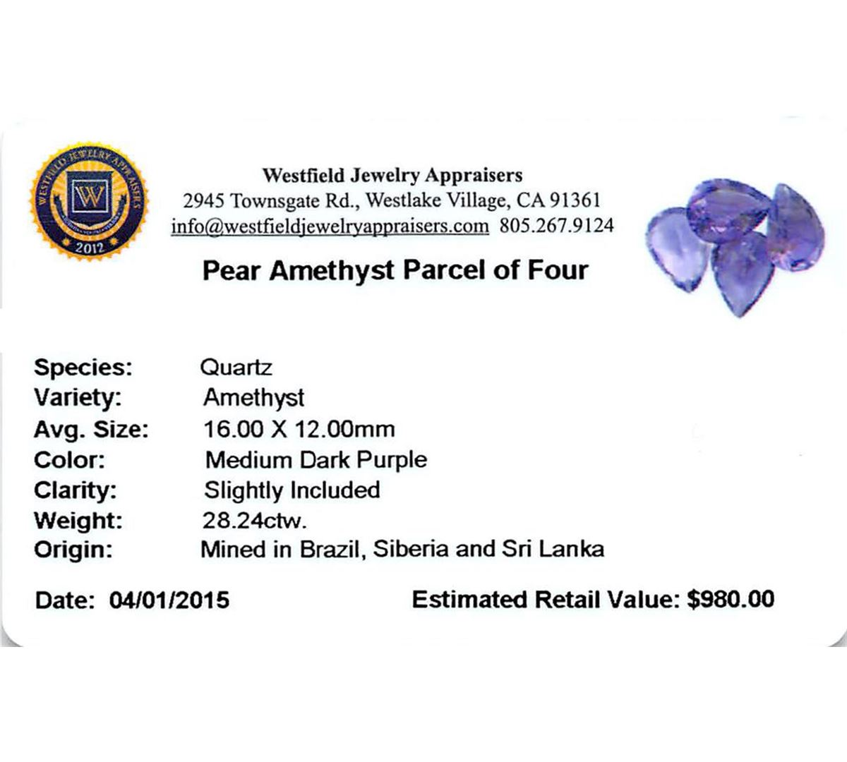 Four pear mixed cut natural amethysts exact total weight 28.24ct., clarity is slightly included, type II, medium dark, very slightly grayish, purple color, (GIA P 6/3), cut is good. Westfield Appraised at $980.00.