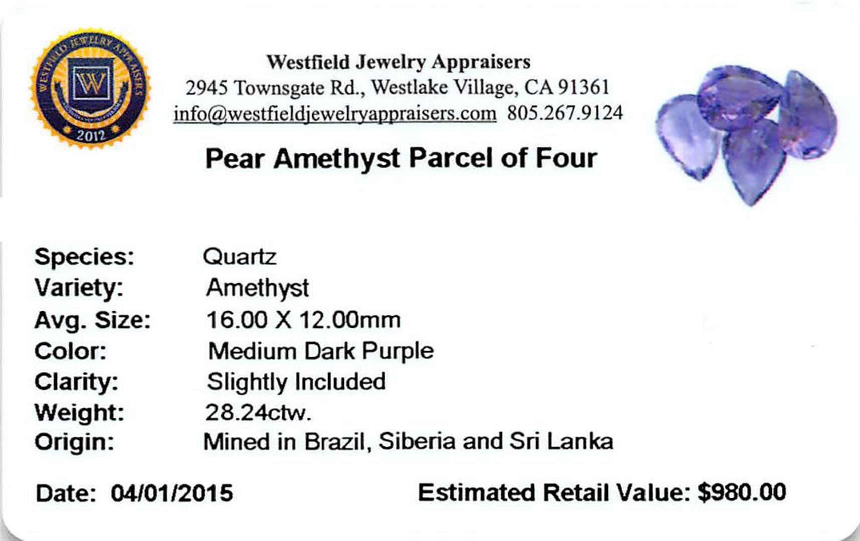 Four pear mixed cut natural amethysts exact total weight 28.24ct., clarity is slightly included, type II, medium dark, very slightly grayish, purple color, (GIA P 6/3), cut is good. Westfield Appraised at $980.00.