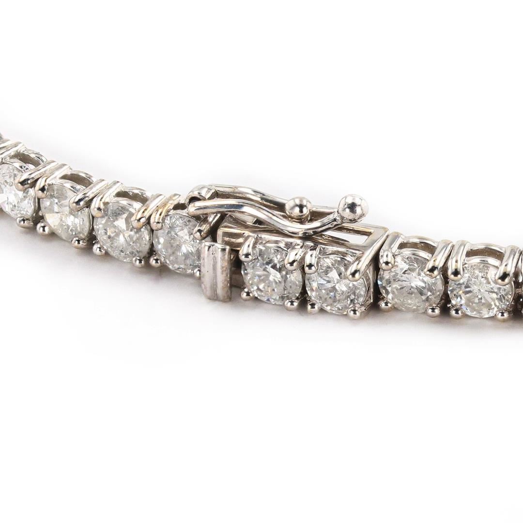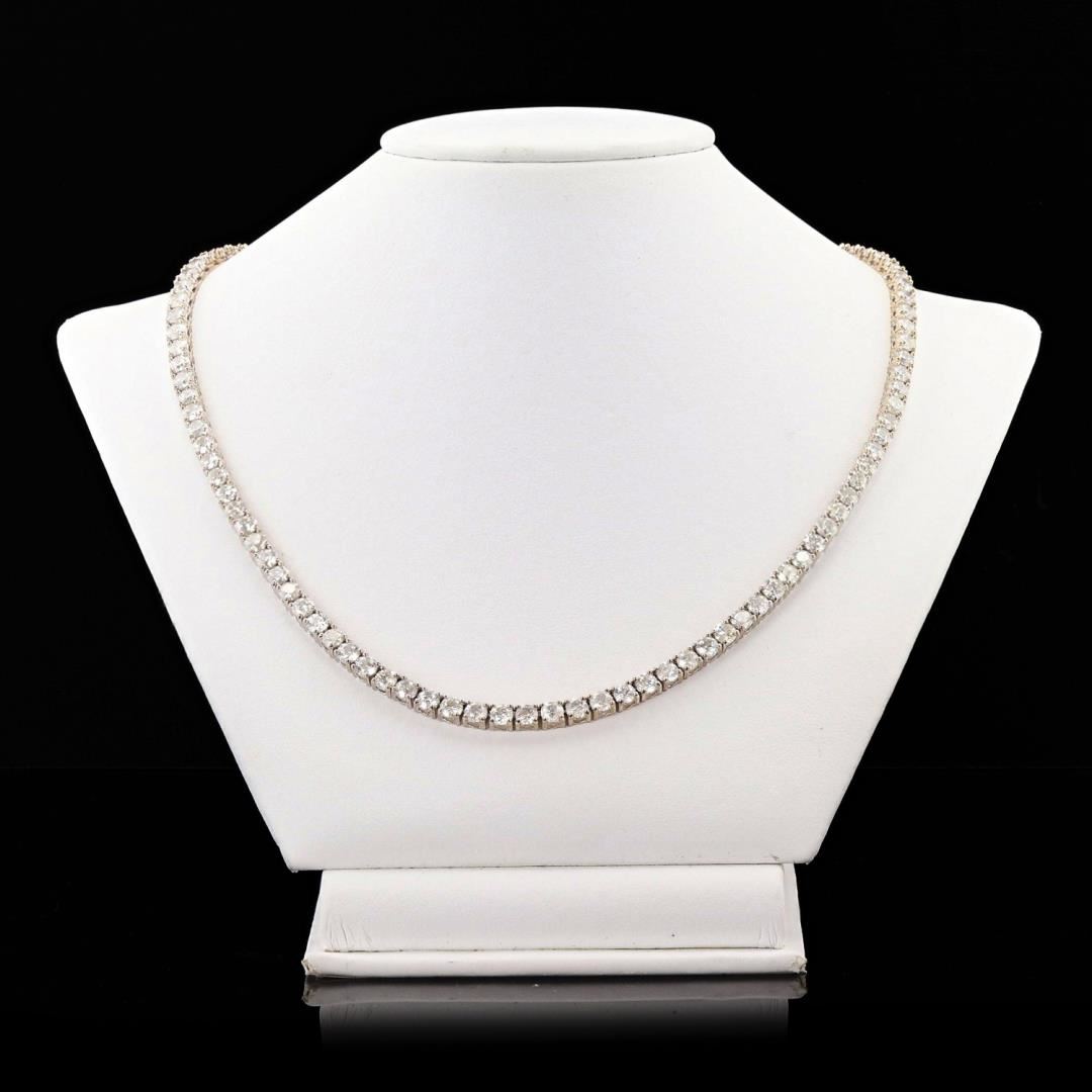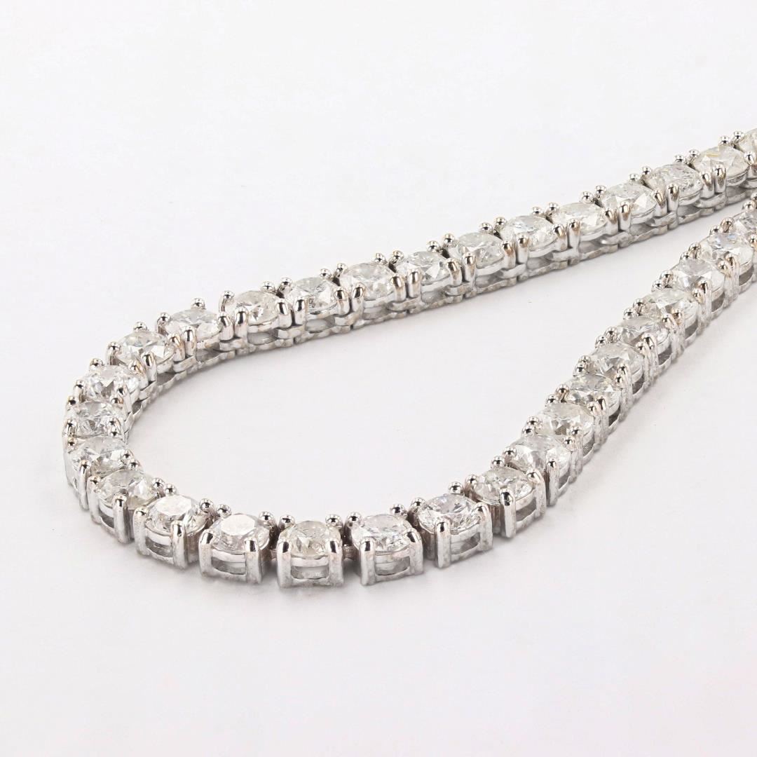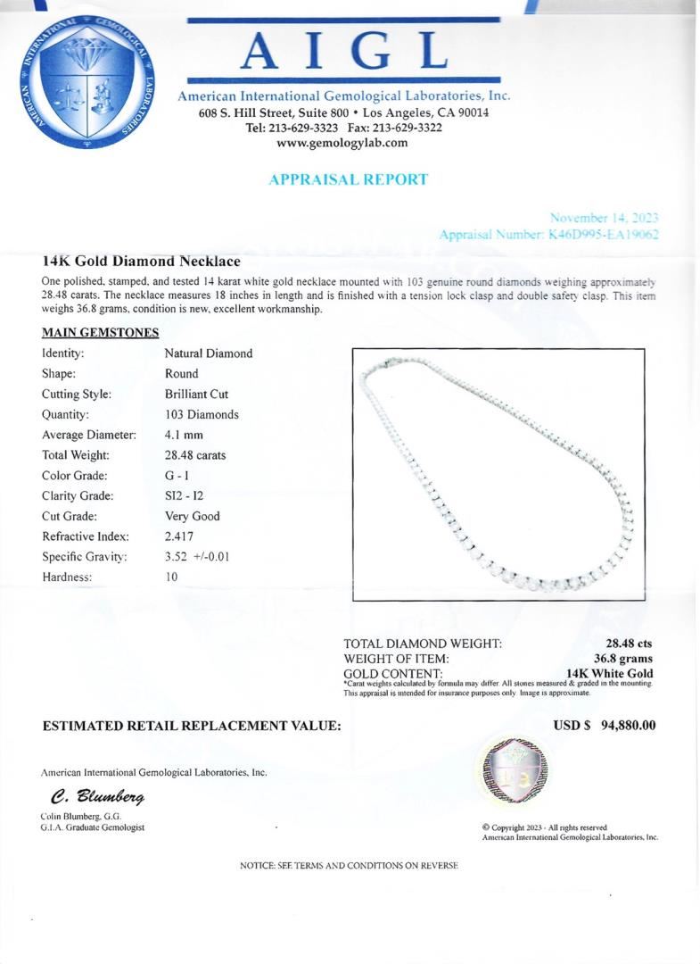 One polished. stamped. and tested 14 karat white gold necklace mounted with 103 genuine round diamonds weighing approximately 28.48 carats. The necklace measures 18 inches in length and is finished with a tension lock clasp and double safety clasp. This item weighs 36.8 grams, condition is new, excellent workmanship. #MAIN GEMSTONES# Identity: Natural Diamond Shape: Round Cutting Style: Brilliant Cut Quantity: 103 Diamonds Average Diameter: 4.1mm Total Weight: 28.48 carats Color Grade: G-I Clarity Grade: SI2-I2 Cut Grade: Very Good Refractive Index: 2.417 Specific Gravity: 3.52 +/-0.01 Hardness: 10 TOTAL DIAMOND WEIGHT: 28.48 ctw WEIGHT OF ITEM: 36.8 grams GOLD CONTENT: 14K White Gold