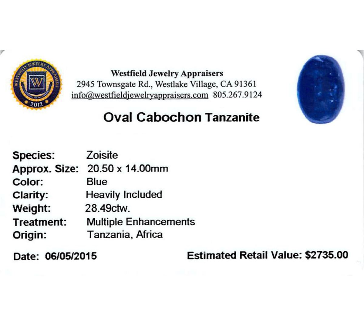 One oval cabochon cut natural tanzanite, measuring 20.50 x 14.00 x 11.00mm, exact weight 28.49ct., clarity is heavily included, type I, dark, very slightly grayish, blue color, (GIA B 7/3), cut is good. Transmitting light somewhat diffusely, transparent to translucent. Naturally occurring internal & external characteristics are present. Indications of heat treatment. Westfield Appraised at $2,735.00.