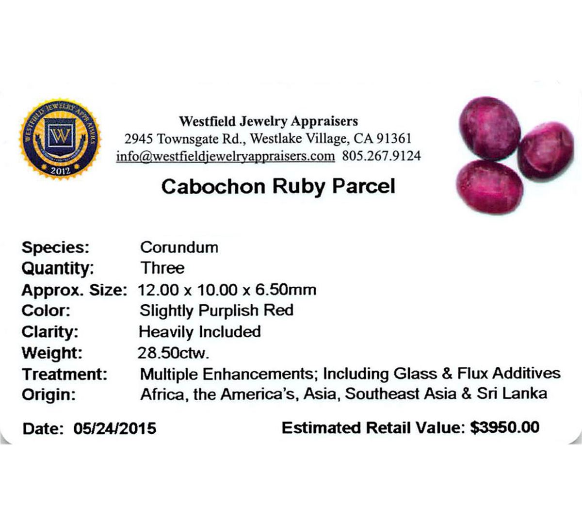 Three oval cabochon cut natural rubies, measuring 12.00 x 10.00 x 6.50mm, exact total weight 28.50ct., clarity is heavily included, type II, dark, very slightly brownish, slightly purplish red color, (GIA slpR 7/3), cut is good. Transmitting light diffusely, translucent to opaque. Naturally occurring internal & external characteristics are present. Indications of laboratory high temperature heat treatment, with glass & flux additives. Ruby has a low tolerance to rhodium plating, repolishing the surface & ultrasonic cleaning. Westfield Appraised at $3,950.00.