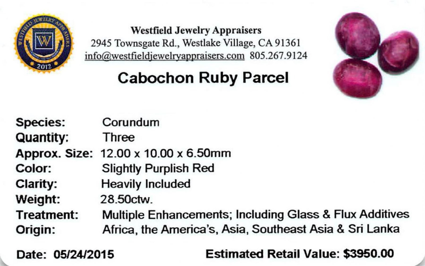 Three oval cabochon cut natural rubies, measuring 12.00 x 10.00 x 6.50mm, exact total weight 28.50ct., clarity is heavily included, type II, dark, very slightly brownish, slightly purplish red color, (GIA slpR 7/3), cut is good. Transmitting light diffusely, translucent to opaque. Naturally occurring internal & external characteristics are present. Indications of laboratory high temperature heat treatment, with glass & flux additives. Ruby has a low tolerance to rhodium plating, repolishing the surface & ultrasonic cleaning._x000D_ Westfield Appraised.