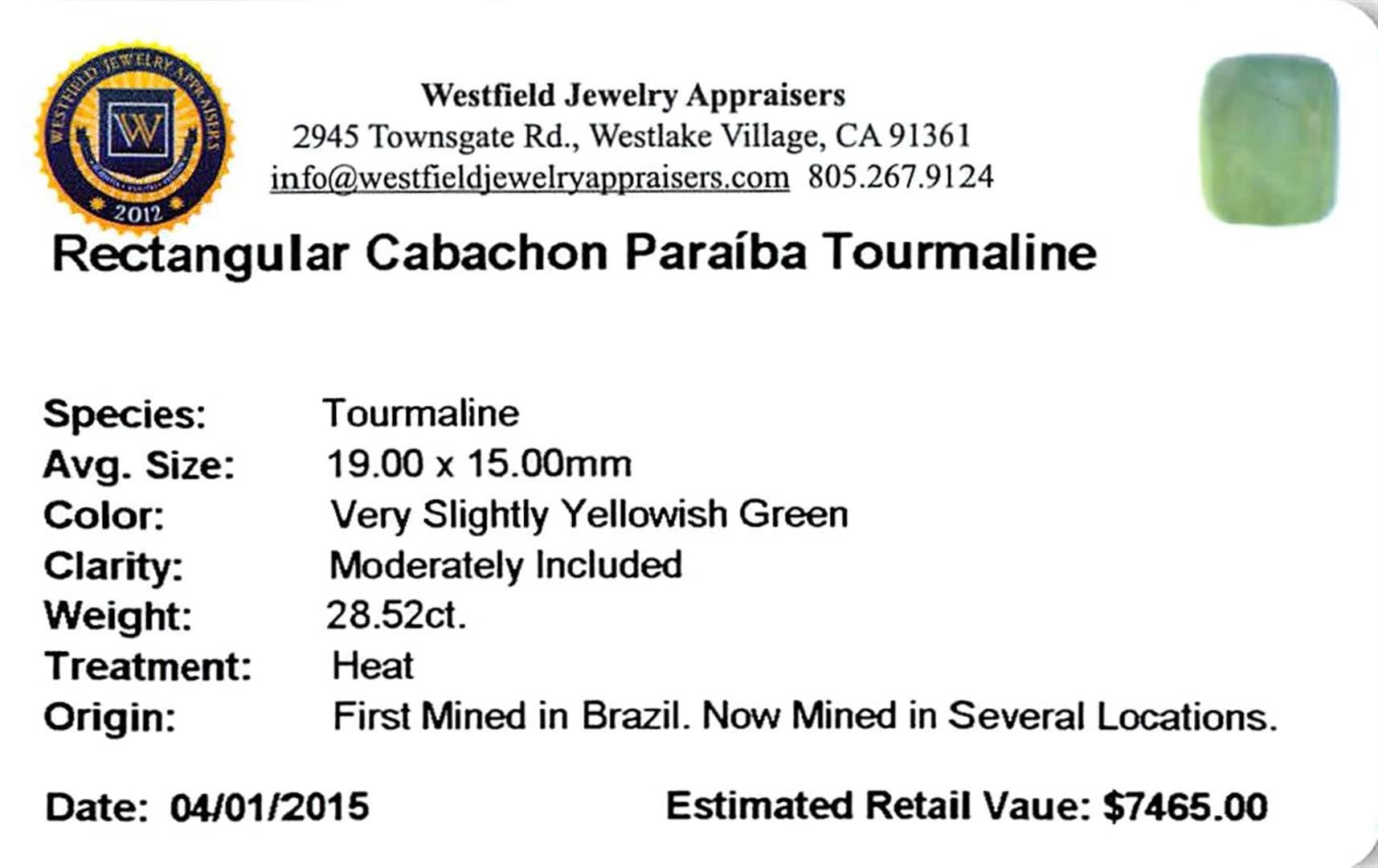 One rectangular cabochon cut natural Paraiba tourmaline exact weight 28.52ct., clarity is moderately included, cut is good. Westfield Appraised at $7,465.00.