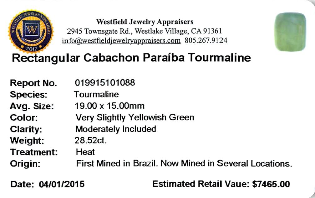 One rectangular cabochon cut natural Paraiba tourmaline exact weight 28.52ct., clarity is moderately included, cut is good. Westfield Appraised at $7,465.00.
