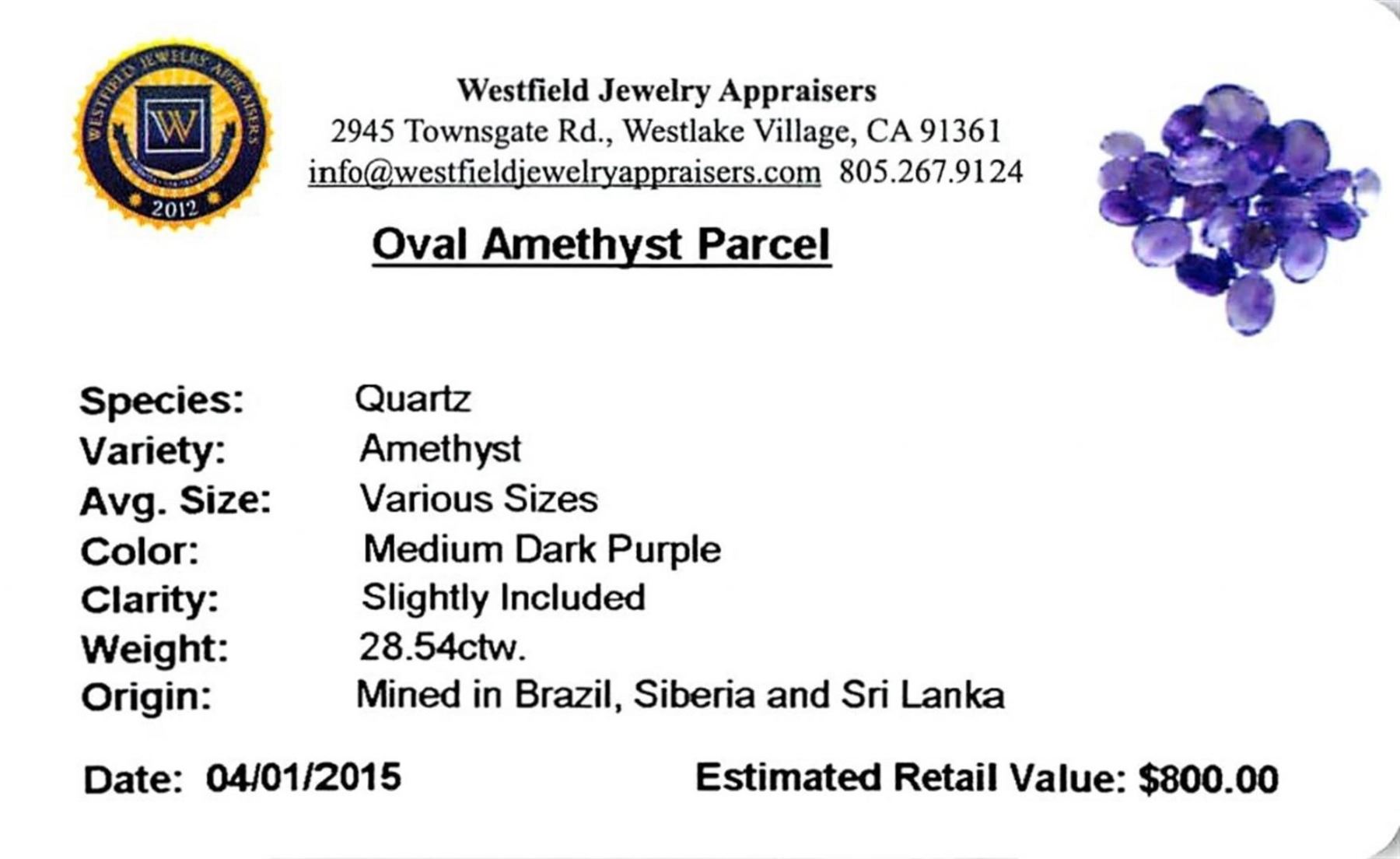 Twenty-six oval mixed cut natural amethysts exact total weight 28.54ct., clarity is slightly included, type II, medium dark, very slightly grayish, purple color, (GIA P 6/3), cut is good. Westfield Appraised.