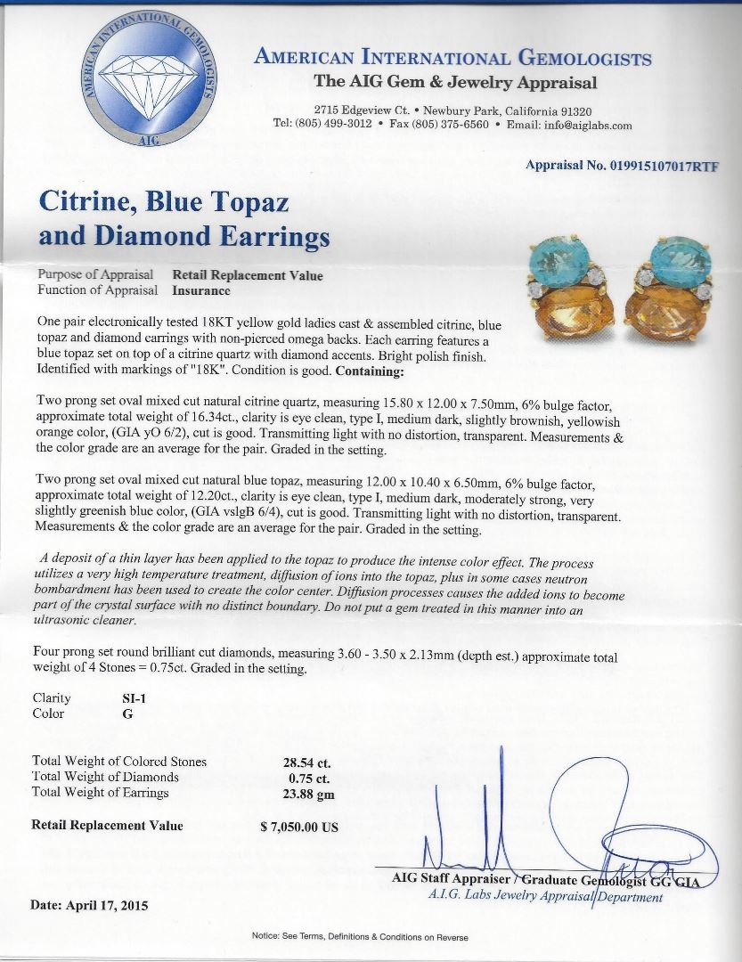 One pair electronically tested 18KT yellow gold ladies cast & assembled citrine, blue topaz and diamond earrings with non-pierced omega backs. Each earring features a blue topaz set on top of a citrine quartz with diamond accents. Bright polish finish. Identified with markings of "18K". Condition is good. Containing: Two prong set oval mixed cut natural citrine quartz, measuring 15.80 x 12.00 x 7.50mm, 6% bulge factor, approximate total weight of 16.34ct., clarity is eye clean, type I, medium dark, slightly brownish, yellowish orange color, (GIA yO 6/2), cut is good. Transmitting light with no distortion, transparent. Measurements & the color grade are an average for the pair. Graded in the setting. Two prong set oval mixed cut natural blue topaz, measuring 12.00 x 10.40 x 6.50mm, 6% bulge factor, approximate total weight of 12.20ct., clarity is eye clean, type I, medium dark, moderately strong, very slightly greenish blue color, (GIA vslgB 6/4), cut is good. Transmitting light with no distortion, transparent. Measurements & the color grade are an average for the pair. Graded in the setting. A deposit of a thin layer has been applied to the topaz to produce the intense color effect. The process utilizes a very high temperature treatment, diffusion of ions into the topaz, plus in some cases neutron bombardment has been used to create the color center. Diffusion processes causes the added ions to become part of the crystal surface with no distinct boundary. Do not put a gem treated in this manner into an ultrasonic cleaner. Four prong set round brilliant cut diamonds, measuring 3.60 - 3.50 x 2.13mm (depth est.) approximate total weight of 4 Stones = 0.75ct. Graded in the setting. Clarity: SI-1. Color: G. Total Weight of Colored Stones: 28.54 ct. Total Weight of Diamonds: 0.75 ct. Total Weight of Earrings: 23.88 gm. AIG Appraised at $7,050.00.