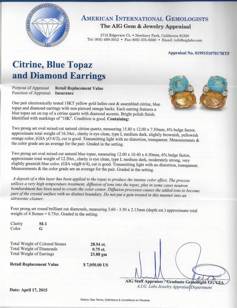 One pair electronically tested 18KT yellow gold ladies cast & assembled citrine, blue topaz and diamond earrings with non-pierced omega backs. Each earring features a blue topaz set on top of a citrine quartz with diamond accents. Bright polish finish. Identified with markings of "18K". Condition is good. Containing: Two prong set oval mixed cut natural citrine quartz, measuring 15.80 x 12.00 x 7.50mm, 6% bulge factor, approximate total weight of 16.34ct., clarity is eye clean, type I, medium dark, slightly brownish, yellowish orange color, (GIA yO 6/2), cut is good. Transmitting light with no distortion, transparent. Measurements & the color grade are an average for the pair. Graded in the setting. Two prong set oval mixed cut natural blue topaz, measuring 12.00 x 10.40 x 6.50mm, 6% bulge factor, approximate total weight of 12.20ct., clarity is eye clean, type I, medium dark, moderately strong, very slightly greenish blue color, (GIA vslgB 6/4), cut is good. Transmitting light with no distortion, transparent. Measurements & the color grade are an average for the pair. Graded in the setting. A deposit of a thin layer has been applied to the topaz to produce the intense color effect. The process utilizes a very high temperature treatment, diffusion of ions into the topaz, plus in some cases neutron bombardment has been used to create the color center. Diffusion processes causes the added ions to become part of the crystal surface with no distinct boundary. Do not put a gem treated in this manner into an ultrasonic cleaner. Four prong set round brilliant cut diamonds, measuring 3.60 - 3.50 x 2.13mm (depth est.) approximate total weight of 4 Stones = 0.75ct. Graded in the setting. Clarity: SI-1. Color: G. Total Weight of Colored Stones: 28.54 ct. Total Weight of Diamonds: 0.75 ct. Total Weight of Earrings: 23.88 gm. AIG Appraised at $7,050.00.