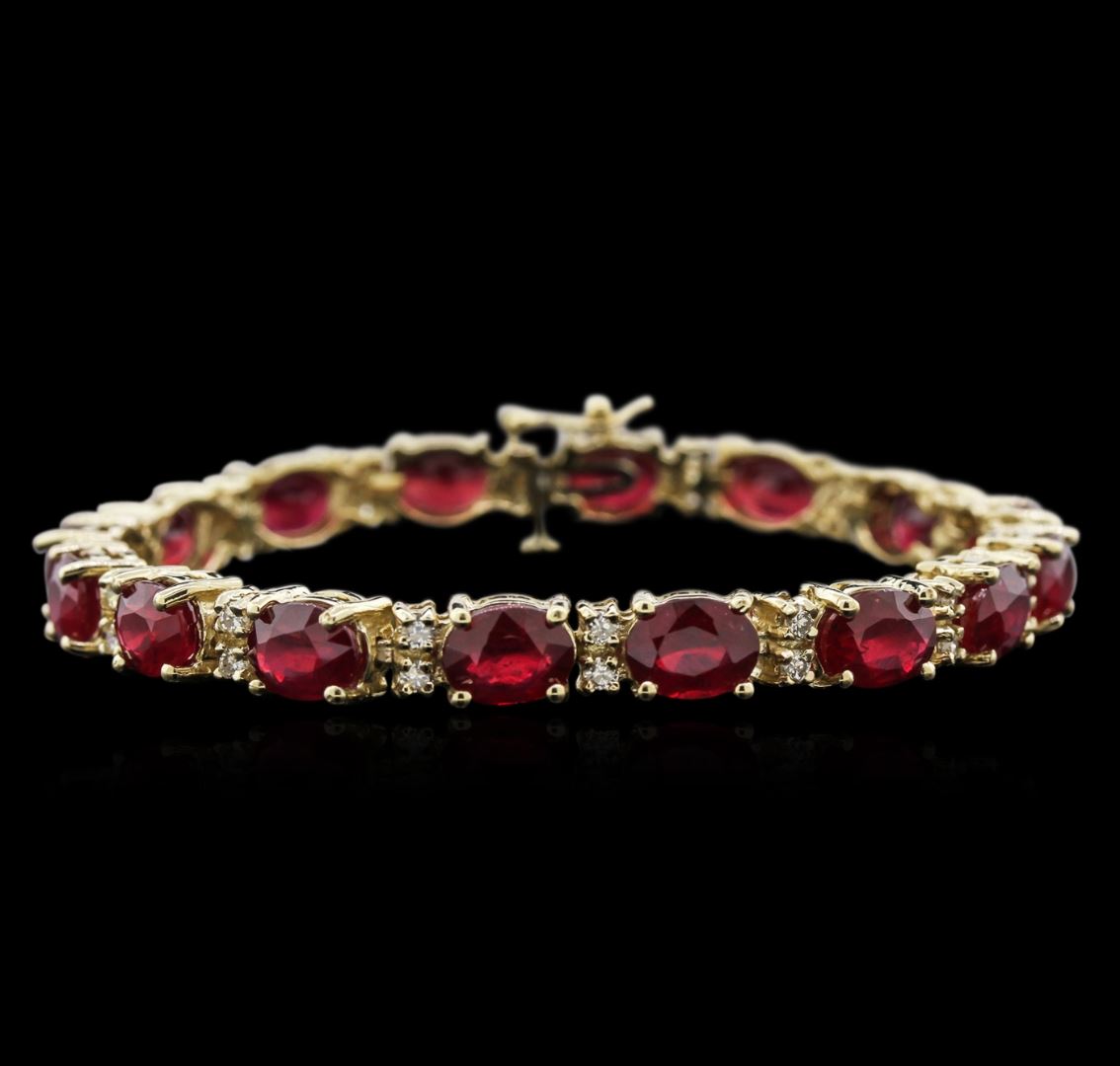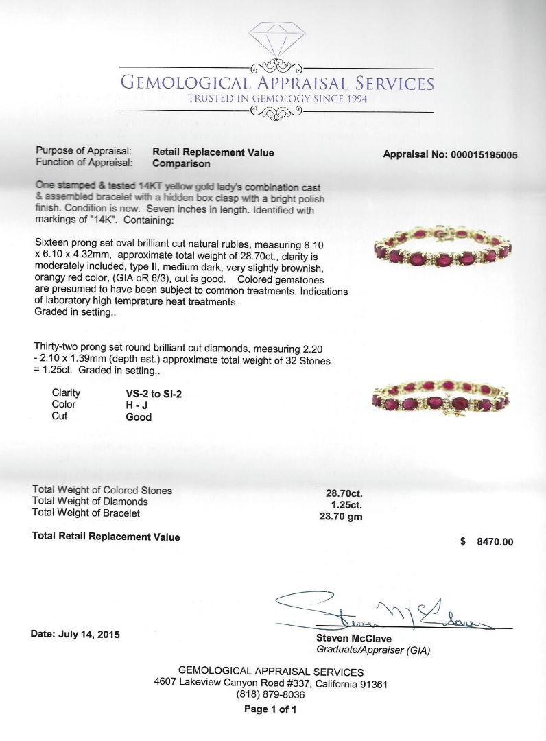 One stamped & tested 14KT yellow gold lady's combination cast & assembled bracelet with a hidden box clasp with a bright polish finish. Condition is new. Seven inches in length. Identified with markings of "14K". Containing: Sixteen prong set oval brilliant cut natural rubies, measuring 8.10 x 6.10 x 4.32mm, approximate total weight of 28.70ct., clarity is moderately included, type II, medium dark, very slightly brownish, orangy red color, (GIA oR 6/3), cut is good. Colored gemstones are presumed to have been subject to common treatments. Indications of laboratory high temperature heat treatments. Graded in setting. Thirty-two prong set round brilliant cut diamonds, measuring 2.20 - 2.10 x 1.39mm (depth est.) approximate total weight of 32 Stones = 1.25ct. Graded in setting. Clarity: VS-2 to SI-2. Color: H - J. Cut: Good. Total Weight of Colored Stones: 28.70ct. Total Weight of Diamonds: 1.25ct. Total Weight of Bracelet: 23.70 gm. GAS Appraised at $8,470.00.