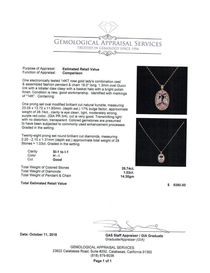 One electronically tested 14KT rose gold lady's combination cast & assembled fashion pendant & chain 18.0' long, 1.3mm oval Gucci link with a lobster claw clasp with a basket halo with a bright polish finish. Identified with markings of '14K'. Condition is new, good workmanship. Containing: One prong set oval modified brilliant cut natural kunzite, measuring 23.05 x 13.72 x 11.60mm, (depth est.) 17%. bulge factor, approximate weight of 28.74ct., clarity is eye clean, light, moderately strong, purple red color, (GIA PR 3/4), cut is very good. Transmitting light with no distortion, transparent. Colored gemstones are presumed to have been subjected to commonly used enhancement processes. Graded in the setting. Twenty-Eight prong set round brilliant cut diamonds, measuring 2.20 - 2.10 x 1.31mm (depth est.) approximate total weight of 28 Stones = 1.03ct. Graded in the setting. Clarity SI-1 to I-1. Color: H - I Cut Good. Total Weight of Colored Stones 28.74ct.. Total Weight of Diamonds 1.03ct.. Total Weight of Pendant & Chain 14.30gm. GAS Appraised.