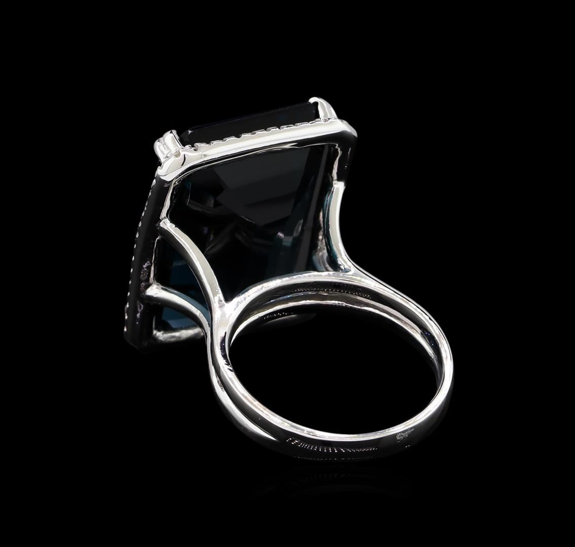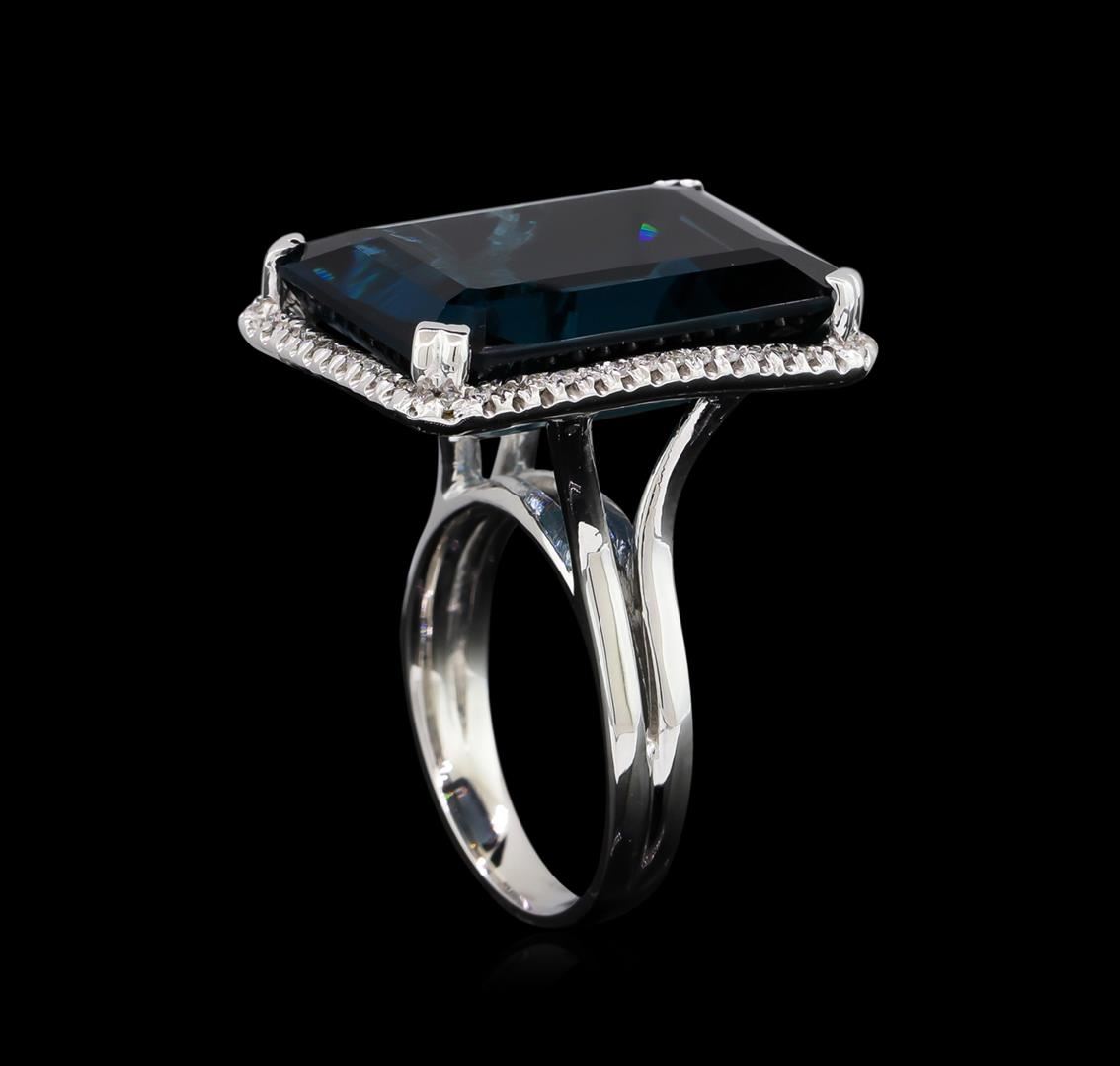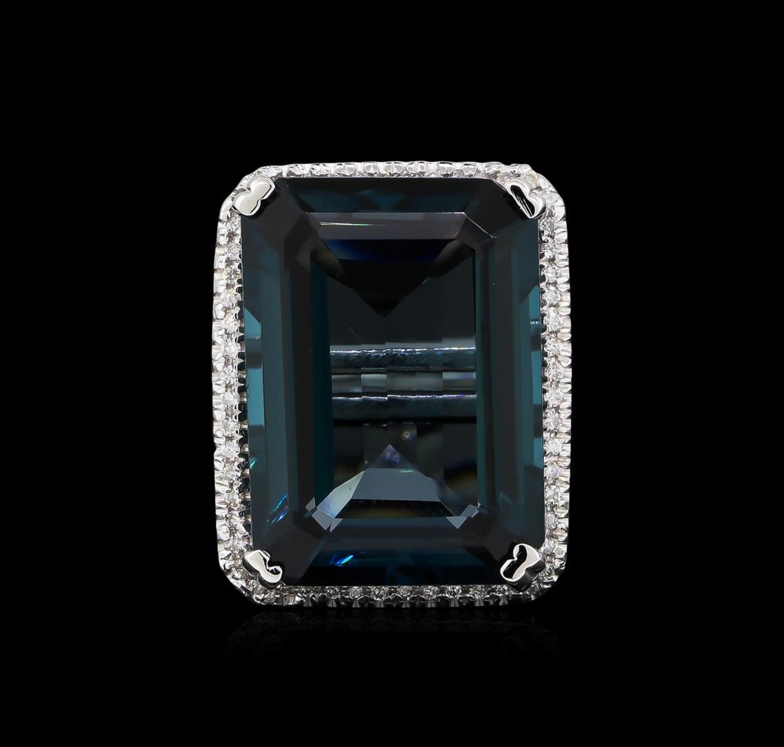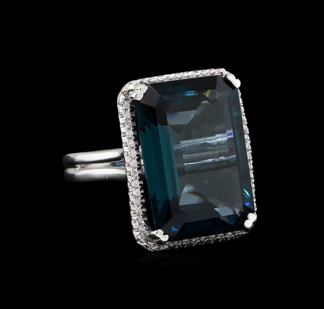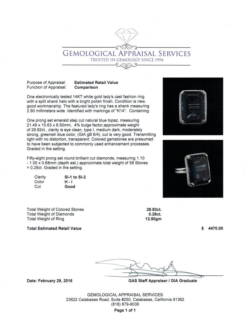 One electronically tested 14KT white gold lady's cast fashion ring with a split shank halo with a bright polish finish. The featured lady's ring has a shank measuring 2.90 millimeters wide. Identified with markings of "K14". Condition is new, good workmanship. Containing: One prong set emerald step cut natural blue topaz, measuring 21.49 x 15.63 x 8.50mm, 4%. bulge factor, approximate weight of 28.82ct., clarity is eye clean, type I, medium dark, moderately strong, greenish blue color, (GIA gB 6/4), cut is very good. Transmitting light with no distortion, transparent. Colored gemstones are presumed to have been subjected to commonly used enhancement processes. Graded in the setting. Fifty-Eight prong set round brilliant cut diamonds, measuring 1.10 - 1.05 x 0.68mm (depth est.) approximate total weight of 58 Stones = 0.28ct. Graded in the setting. Clarity: SI-1 to SI-2. Color: H - I. Cut Good. Total Weight of Colored Stones 28.82ct. Total Weight of Diamonds 0.28ct. Total Weight of Ring 12.80gm. GAS Appraised at $4,470.00.
