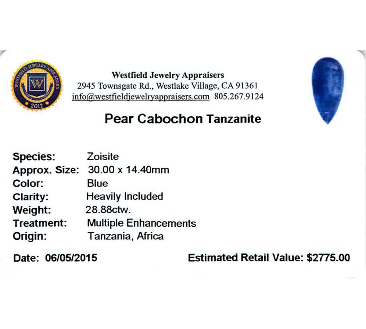 One pear cabochon cut natural tanzanite, measuring 30.00 x 14.40 x 7.00mm, exact weight 28.88ct., clarity is heavily included, type I, dark, very slightly grayish, blue color, (GIA B 7/3), cut is good. Transmitting light somewhat diffusely, translucent. Naturally occurring internal & external characteristics are present. Indications of heat treatment. Westfield Appraised at $2,775.00.