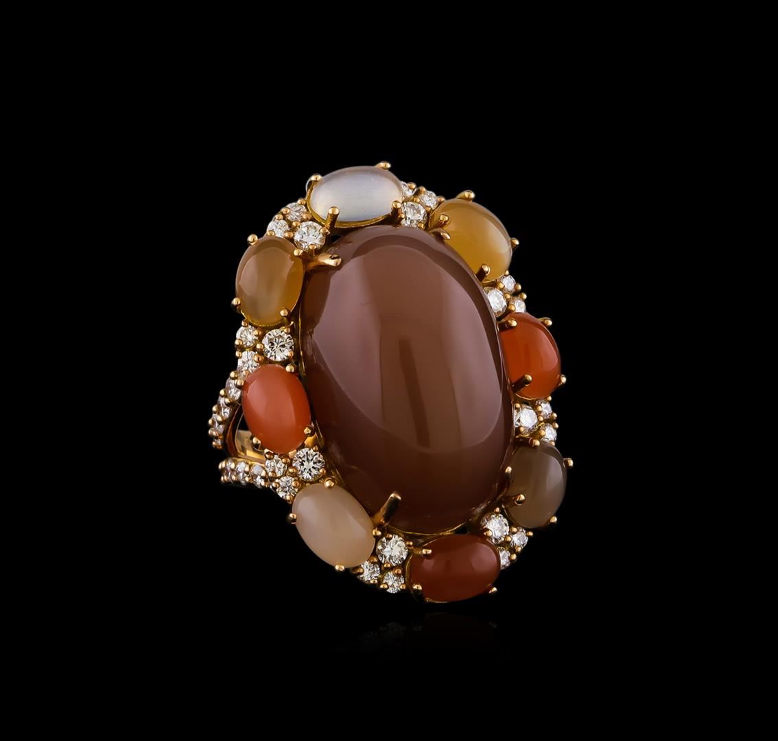 One electronically tested 18KT yellow gold ladies cast & assembled sunstone, moonstone and diamond ring with a bright polish finish. The ring features a cat's eye sunstone cabochon set within a stylized multi color sunstone, moonstone and diamond bezel supported by diamond set split shoulders, completed by a grooved four and one-half millimeter wide band. Trademark is ZEN. Identified with markings of "750". Condition is new, good workmanship. Containing: One prong set oval cabochon cut natural cat's eye sunstone, measuring 22.50 x 14.50 x 9.75mm, approximate weight of 23.27ct., medium, slightly brownish, slightly purplish red color, (GIA slpR 5/2), cut is good. This stone has a partly complete eye with weak intensity, good movement and good centering. Transmitting light very diffusely, opaque. Naturally occurring internal & external characteristics are present. Graded in the setting. Eight prong set oval cabochon cut natural sunstone and moonstones, measuring 6.50 x 5.00 x 3.10mm, approximate total weight of 5.71ct. Transmitting light somewhat diffusely to very diffusely, translucent to opaque. Naturally occurring internal & external characteristics are present. Measurements are an average for the group. The group is composed of a mix of natural natural orangy red sunstone, orangy red cat's eye sunstone, yellowish orange sunstone, yellowish orange cat's eye sunstone and moonstone. Eight prong set round brilliant cut diamonds, measuring 2.20 - 2.20 x 1.32mm (depth est.) approximate total weight of 8 Stones = 0.40ct. Graded in the setting. Clarity: VS-1 to VS-2. Color: G - I Forty-Four prong set round brilliant cut diamonds, measuring 1.80 - 1.50 x 0.99mm (depth est.) approximate total weight of 44 Stones = 0.80ct. Graded in the setting. Clarity: VS-1 to SI-1. Color: G - I. Total Weight of Colored Stones 28.98ct. Total Weight of Diamonds 1.20ct. Total Weight of Ring 17.48gm. AIG Appraised at $7,265.00.