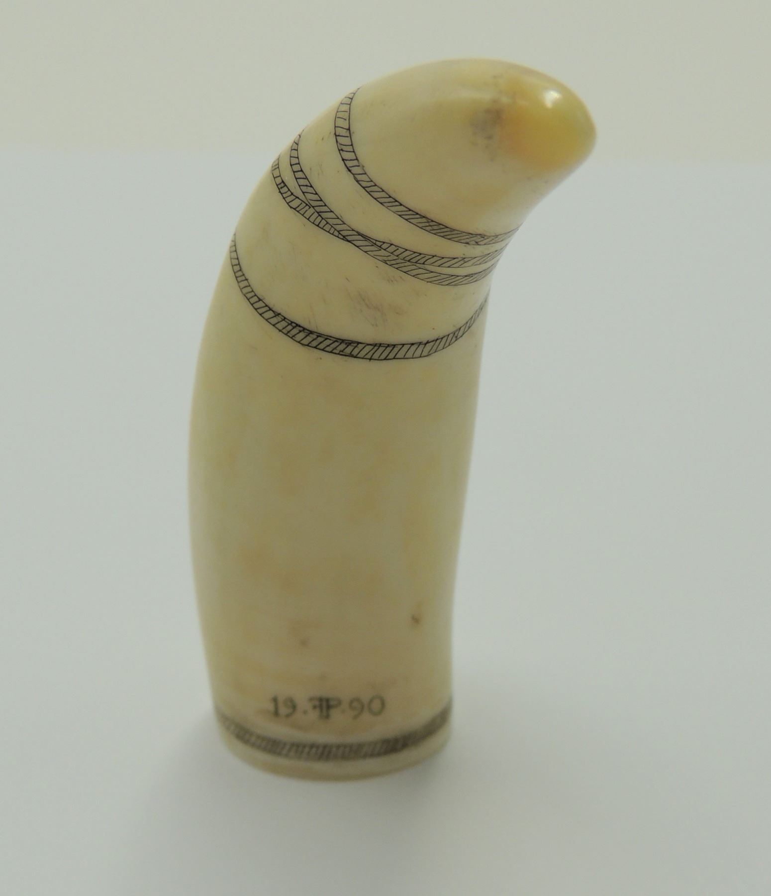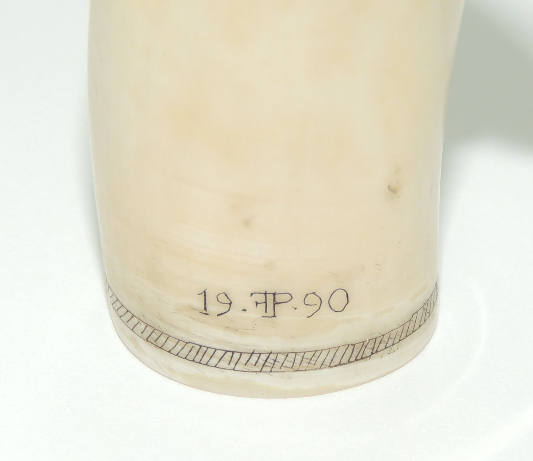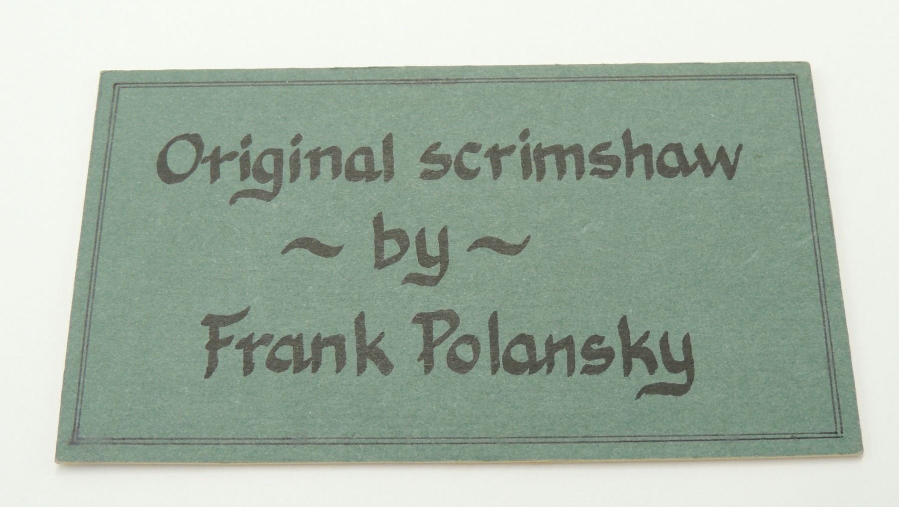 BONE IVORY WHALES TOOTH SIGNED BY FRANK POLANSKY 1990 ON REVERSE WITH CARD
