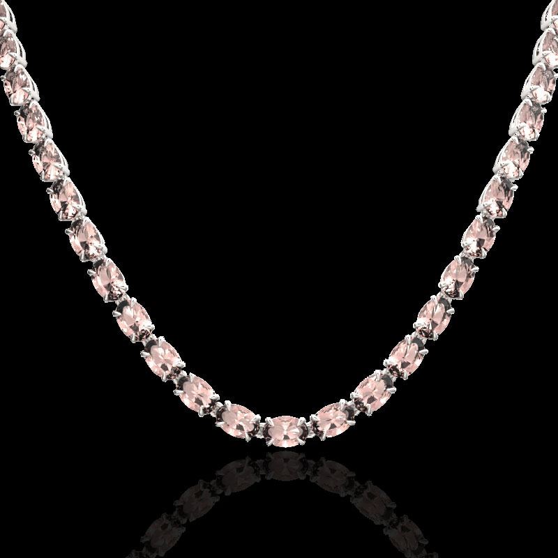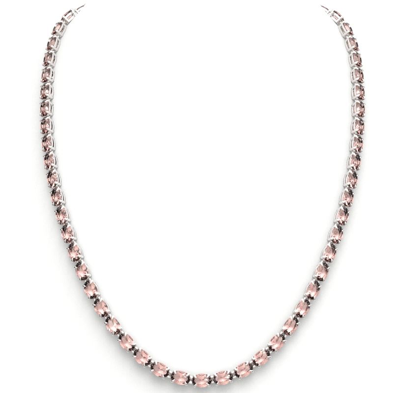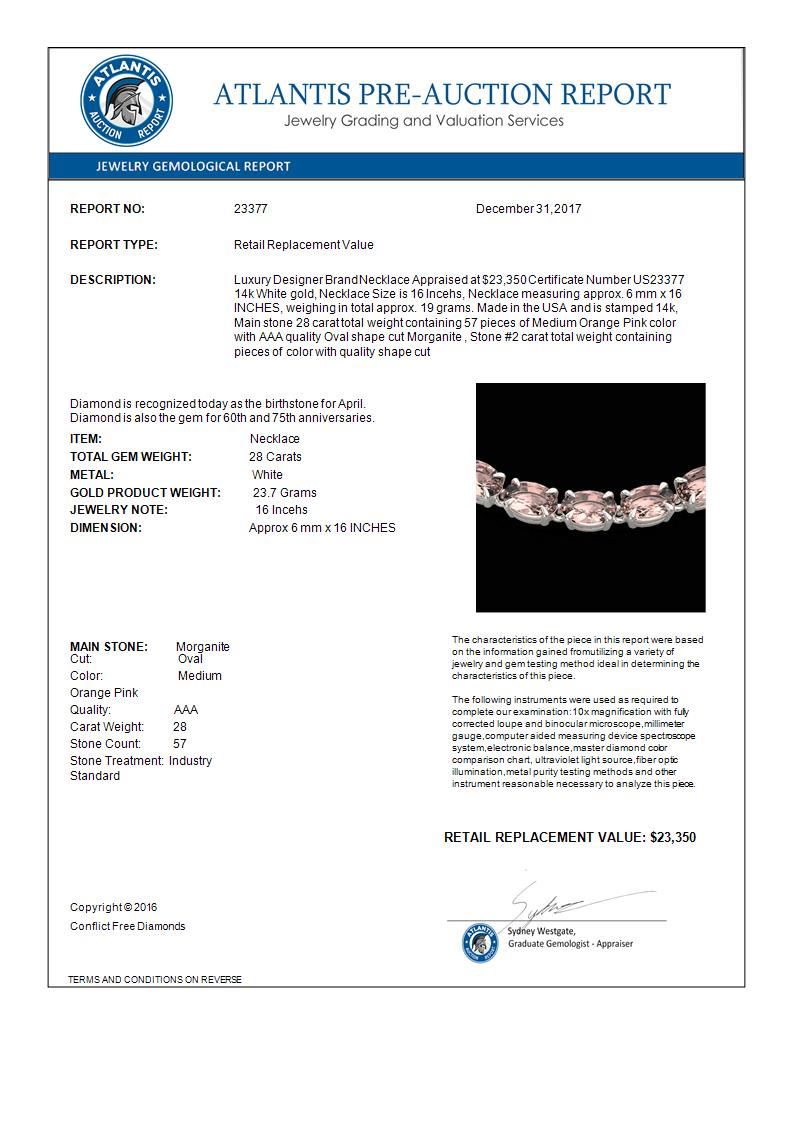REF-326W9F -23377 ---- 28 CTW Morganite Eternity Tennis Necklace 14K White Gold ---- Luxury Designer Brand Necklace Appraised at $23,350 Certificate Number US23377 14k White gold, Necklace Size is 16 Incehs, Necklace measuring approx. 6 mm x 16 INCHES, weighing in total approx. 19 grams. Made in the USA and is stamped 14k, Main stone 28 carat total weight containing 57 pieces of Medium Orange Pink color with AAA quality Oval shape cut Morganite , Stone #2 carat total weight containing pieces of color with quality shape cut