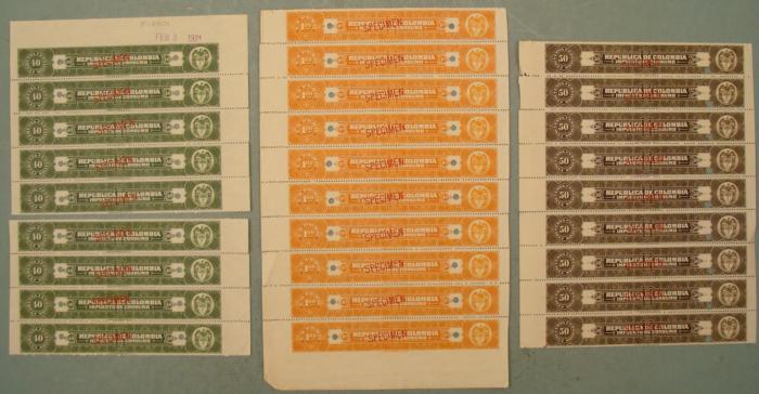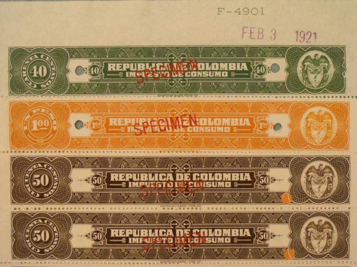 These (28) plate block tax stamps (in 4 separate sections) are from Republic De Colombia, marked "IMPUESTO DE CONSUMO." The denominations are 40 Centavos, 50 Centavos, and 1 Peso. Each has a red "SPECIMEN" overprint and security punch. The margin is printed with a series number, and stamped with the date: FEB 3 1921. They are marked "American Bank Note Co." They have no gum, and are unused, in very good condition. A few have some slight separation at the perforated edges.