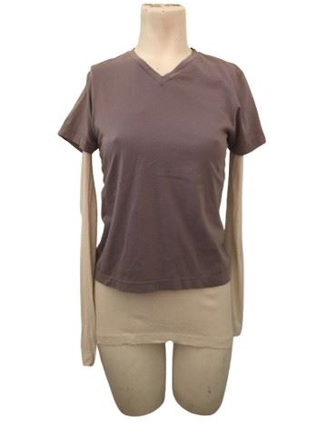 28 Days (2000) - Gwen (Sandra Bullock) screen worn Simple D'anvers long sleeve long length cream colored V-neck with two yellow stains, dark yellow stains on the chest area, with a Mod-o-Doc short sleeve V-neck lavender T-shirt size 1. Includes a Polaroid of her, wearing the costume on set from the wardrobe department continuity book, a copy of the continuity book page for this costume and a studio wardrobe tag noting this costume was worn on day 13 of 28. This was also worn under a sweater during the scene where Gwen and Eddie are watching his show on the couch.