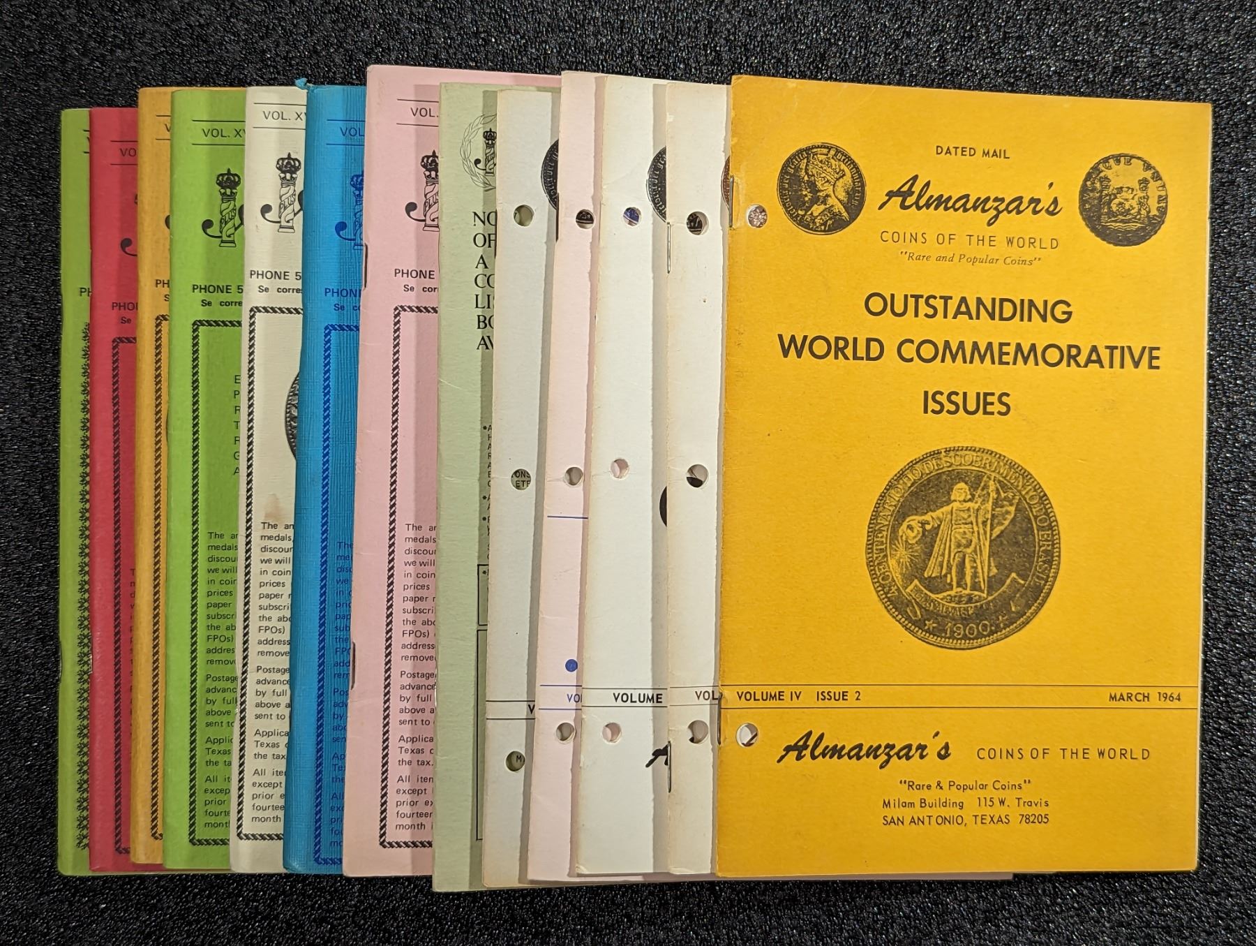 (6) Almanzar's Coins of the World. Volume XV. 1975. Books. 1-500+ Titles. 12mo. Original printed card covers. Fixed Price List. San Antonio. 31 Pages. Fine.
