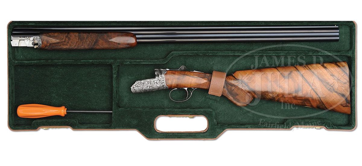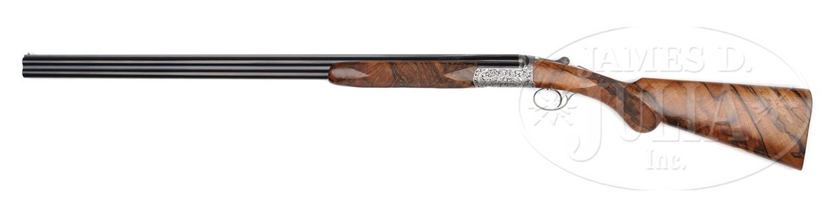 SN F0692. Cal. 28 ga. 2-3/4" Chambers. 30" Mono-bloc bbls with raised, solid, flat, matted rib are marked "Abbiatico & Salvinelli" on left rear portion of top bbl. Bbl flats are stamped with SN, "A & S", 2007 Italian nitro proofs, and with importers mark. Round bodied, low profile, small, coin finished, O/U action is fitted with removable trigger/ firing group with single non-selective trigger. Action has nicely chiseled top fence, and is engraved with very deep relief, large, shaded, scrolled acanthus. "Abbiatico & Salvinelli" is in rib and on each side, and "EXCALIBUR" is across bottom. Engravers signature "C. Marochi" is on right side of trigger housing. Splendidly marbled and lightly flame figured European walnut round knob buttstock measures 15-1/8" over checkered wood butt. 32 LPI point pattern checkering is at grip and a vacant gold oval is on toe line. Matching one piece slim forend has an unusual adaptation of an Anson type release with a sliding latch in Deeley style escutcheon. Bore diameter: top -.555, bottom -.554. Bore restrictions: top -.024 (Full), bottom -.019 (I Mod). Wall thickness: top-.043, bottom -.048. Drop at heel: 2", drop at comb: 1-3/8". Weight: 6 lbs. 6 oz. LOP: 15-1/8". Blue ABS and leatherite trimmed Famars marked case with three combination locks, is lined in green textured velvet. Case contains bags for action and bbls and stock removal tool. PROVENANCE: Certificate with specifics of this gun, and explanation of proofs. CONDITION: Excellent, showing evidence of only light field use. Metal parts retain essentially all of their original finishes with some dark lacquer crazing, and darkening on coin finish of action. Stocks retain nearly all of their orig finish with a few light marks on right side of butt, Left side has a considerable amount of light marks and scratches, most likely from contact with brush. Checkering is excellent. Bores are excellent. Action is tight. Ejectors are slightly out of time. Trigger works. Case is excellent. This fine gun making firm ceased operation in December 2012. Last base price for this model was over $33,000.00. 4-49317 MGM236