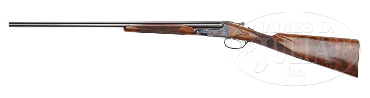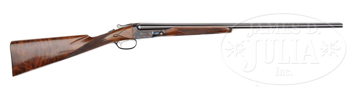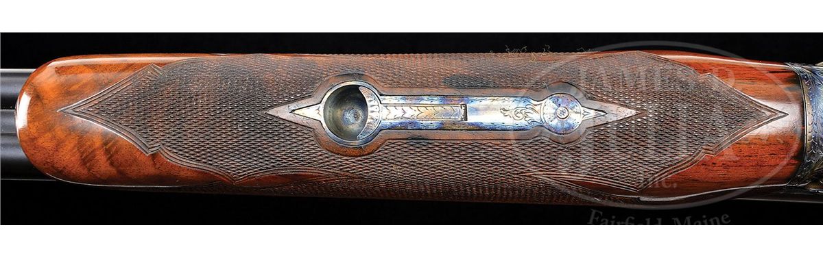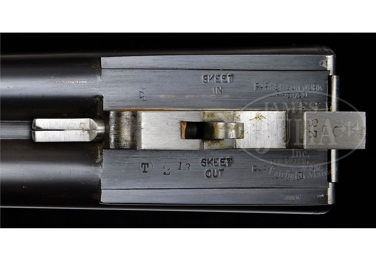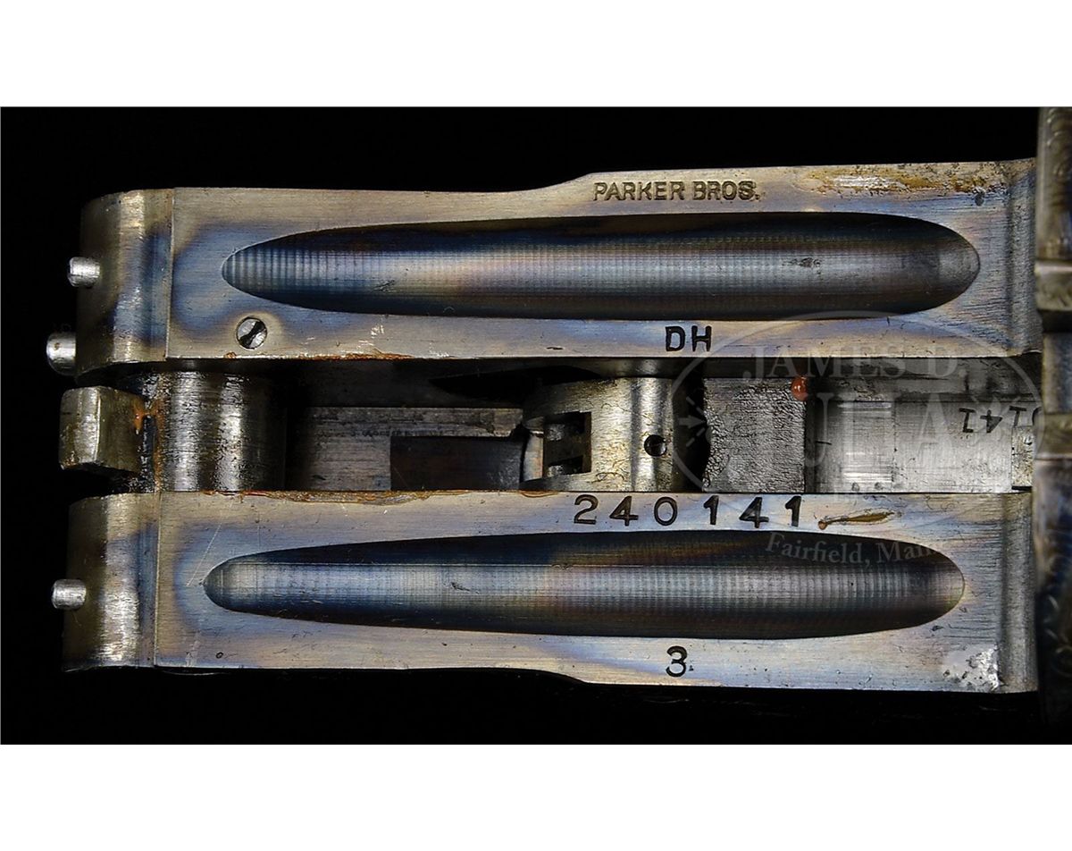 SN 240141. Cal. 28 ga. 2-3/4" Chambers. 00 Frame. 26" Bbls are marked with Parker name and address and "Titanic Steel" on matted rib, fitted with two ivory beads. Bbl flats with Parker proofs, are stamped "SKEET IN SKEET OUT". Typical DH action is fitted with automatic safety and Parker single selective trigger, has correct markings on water table, and typical "D" late style engraving with "Parker" on bottom of action. Nicely stump figured American walnut straight grip buttstock measures 14-1/2" over checkered wood butt, and features typical "DH" checkering, drop points, and a silver oval on toe line engraved "L. A. M." Matching ejector beavertail forend has reinforcing bolt. Parker Gun Identification and Serialization ledger lists this gun as grade "D" with single trigger, ejectors, and capped pistol grip stock. Bore diameter: left-.550, right -.552. Bore restrictions: left -.007 (Skeet), right -.008 (Skeet). Wall thickness: left -.027, right -.024. Drop at heel: 2-1/4", drop at comb: 1-7/16". Weight: 6 lbs. 4 oz. LOP: 14-1/2". CONDITION: Excellent, as completely refinished. Bbls retain nearly all of a fine satin rust blue. Correctly colored rehardening is at nearly 100%. Stocks have only a few minor rubs and marks in their fine satin finish. Bores are excellent. Action is tight. Ejectors are in time. Trigger works. 4-49289 MGM112