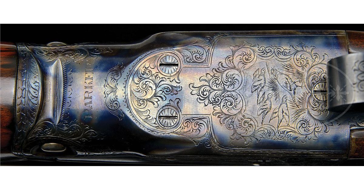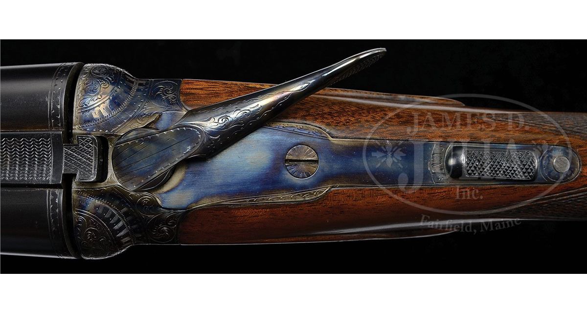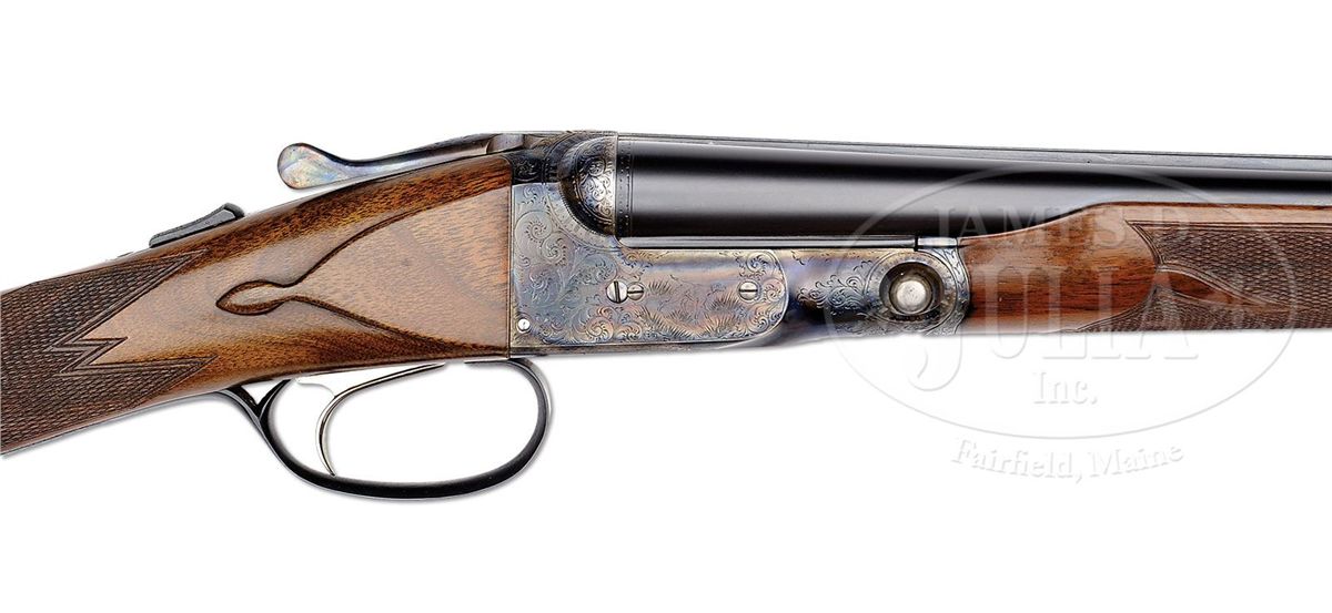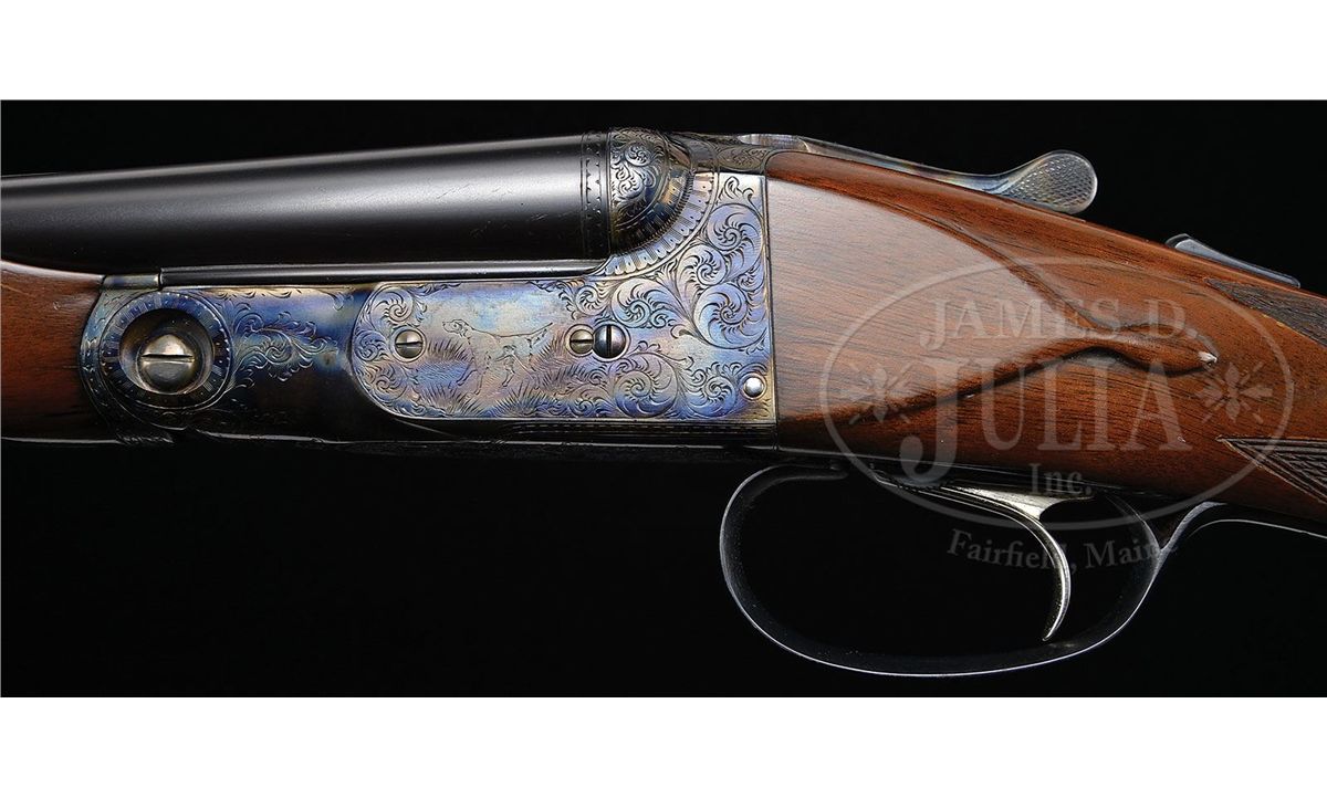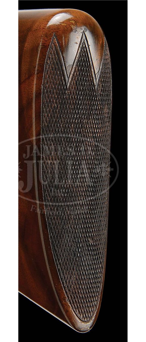 SN 240141. Cal. 28 ga. 2-3/4" Chambers. 00 Frame. 26" Bbls are marked with Parker name and address and "Titanic Steel" on matted rib, fitted with two ivory beads. Bbl flats with Parker proofs, are stamped "SKEET IN SKEET OUT". Typical DH action is fitted with automatic safety and Parker single selective trigger, has correct markings on water table, and typical "D" late style engraving with "Parker" on bottom of action. Nicely stump figured American walnut straight grip buttstock measures 14-1/2" over checkered wood butt, and features typical "DH" checkering, drop points, and a silver oval on toe line engraved "L. A. M." Matching ejector beavertail forend has reinforcing bolt. Parker Gun Identification and Serialization ledger lists this gun as grade "D" with single trigger, ejectors, and capped pistol grip stock. Bore diameter: left-.550, right -.552. Bore restrictions: left -.007 (Skeet), right -.008 (Skeet). Wall thickness: left -.027, right -.024. Drop at heel: 2-1/4", drop at comb: 1-7/16". Weight: 6 lbs. 4 oz. LOP: 14-1/2". CONDITION: Excellent, as completely refinished. Bbls retain nearly all of a fine satin rust blue. Correctly colored rehardening is at nearly 100%. Stocks have only a few minor rubs and marks in their fine satin finish. Bores are excellent. Action is tight. Ejectors are in time. Trigger works. 4-49289 MGM112