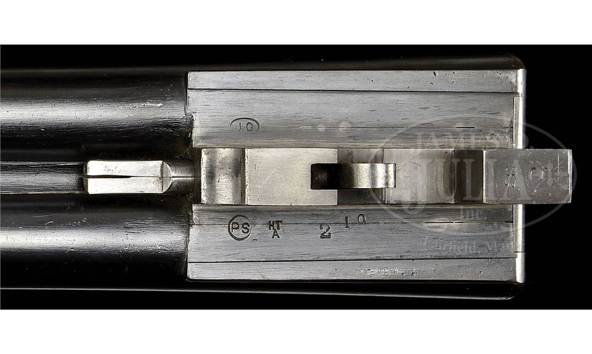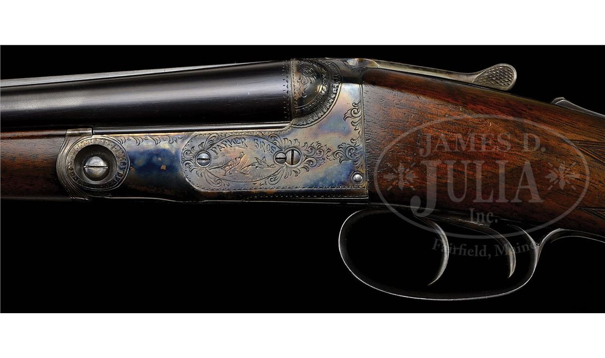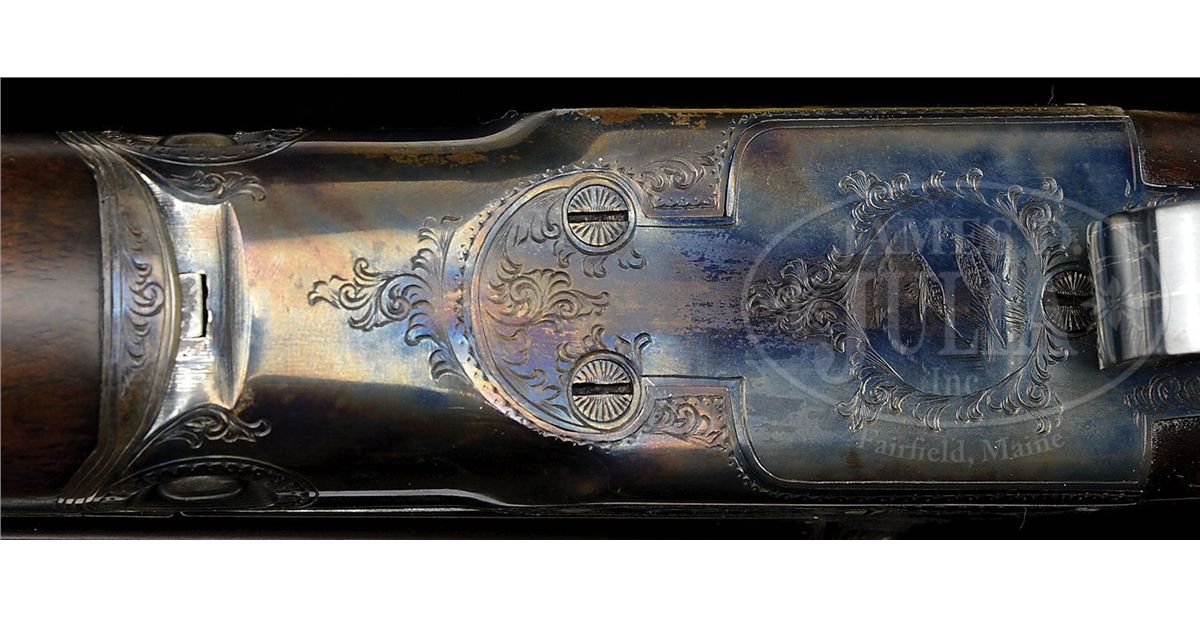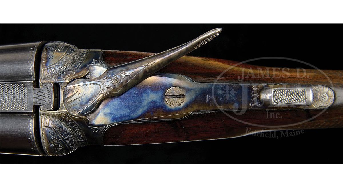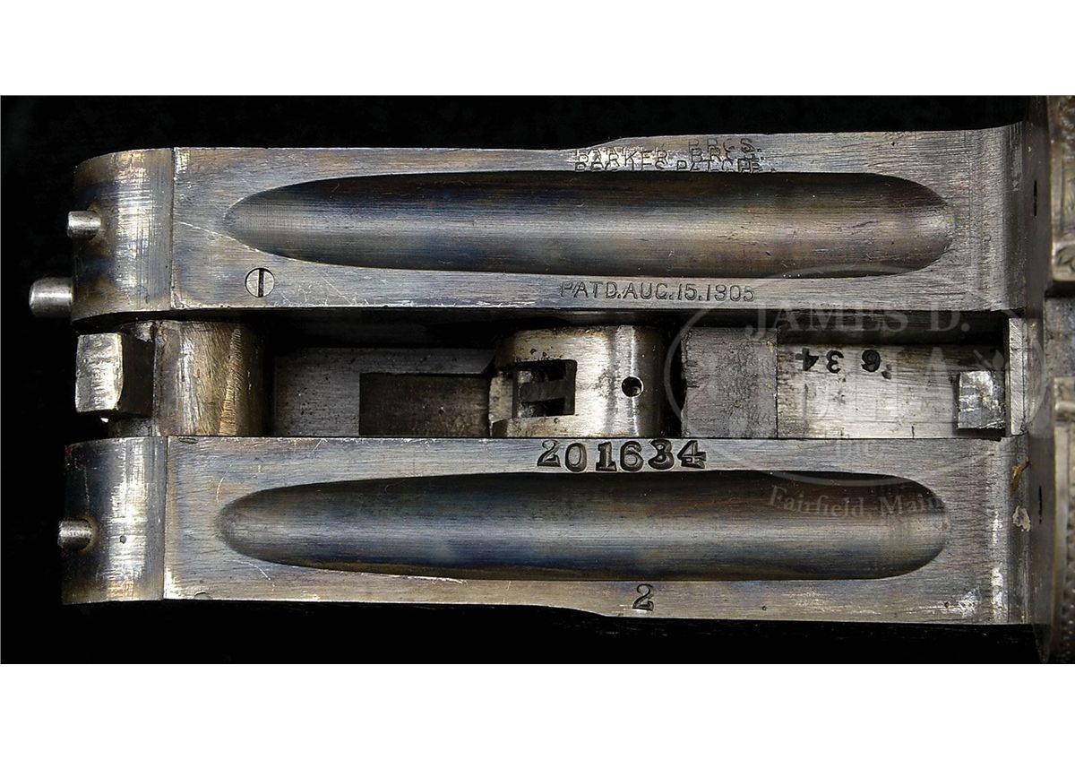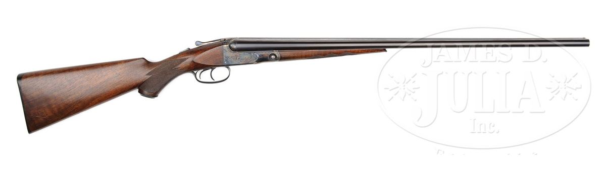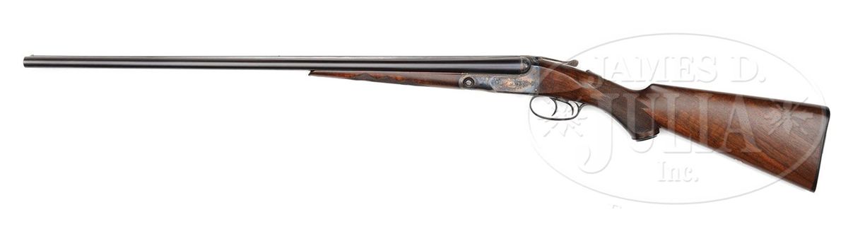 SN 201634. Cal. 28 ga. 00 Frame. 2-1/2" Chambers. 26" Bbls have typical Parker markings, and "Parker Special Steel" on top rib mounted with two silver beads. All correct markings are on bbl flats and water table, and this gun matches all specifications in PARKER GUN IDENTIFICATION & SERIALIZATION ledger. Typically "G" engraved case hardened action features automatic safety and double triggers. Lightly fiddle figured American walnut Parker capped pistol grip buttstock measures 14-1/4" over Parker dogs head buttplate with spur. Matching splinter ejector forend has typical release. Bore diameter: left-.553, right -.552. Bore restrictions: left -.023 (Full), right -.012 (Mod). Wall thickness: left -.025, right -.028. Drop at heel: 2-9/16", drop at comb: 1-7/16". Weight: 5 lbs. 9 oz. LOP: 14-1/4". PROVENANCE: Consignor states that this gun was once owned by Famed Artist, Bob Timberlake. CONDITION: Excellent, as completely refinished. Bbls retain all of a correctly colored blue, over a few marks and light scratches. Action retains 95% bright re-color with some areas of subsequent flecking of left fence and left bottom of action. Stocks retain most of an old oil finish with a number of minor marks and scratches. Checkering does not appear to have been re-cut. Grip cap does not fit well. Bores are excellent. Action is tight. Bbls are on face. Ejectors are in time. A scarce, light, little gun and good looking restoration. 4-49367 MGM285
