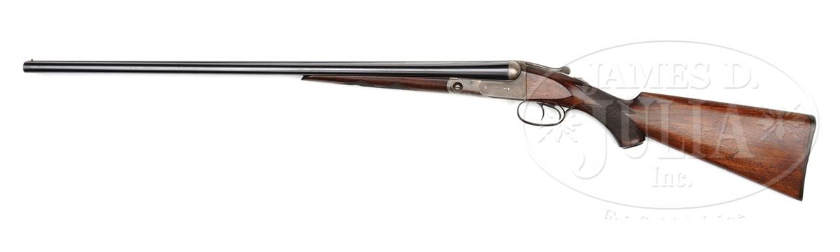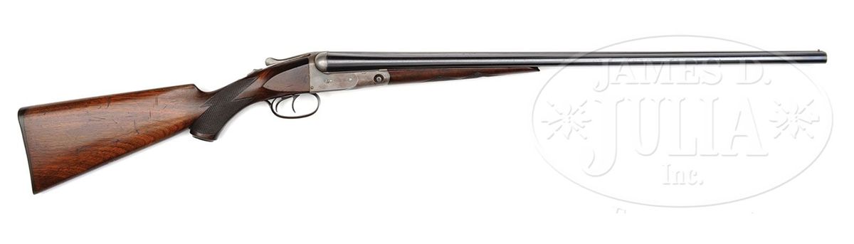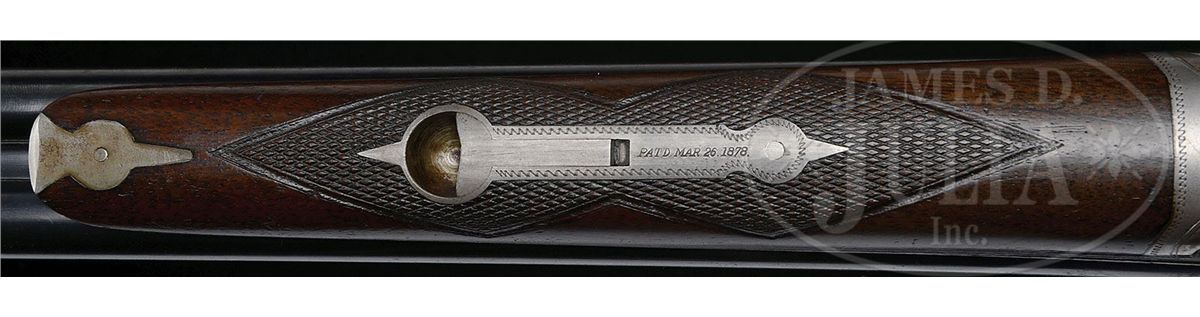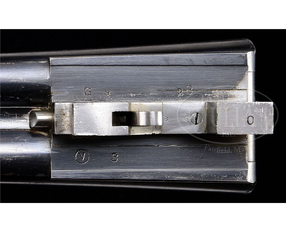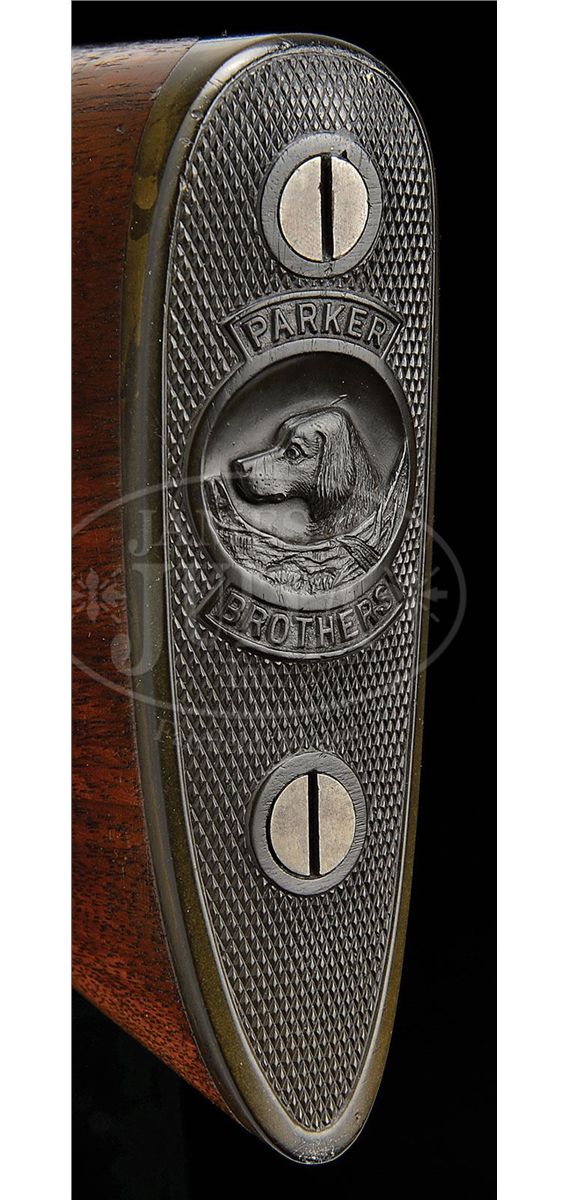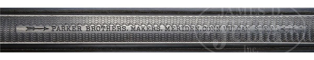 SN 149426. Cal. 28 ga. 2-3/4" Chambers. 0 Frame. 26" Bbls are marked with Parker name, address and "Vulcan Steel" on top of rib. Bbl flats have correct markings. Typical, correctly marked, "V" action features automatic safety and double triggers. Relatively plain American walnut capped pistol grip buttstock measures 14-1/4" over Parker dogs head buttplate with spur. Gun is fitted with standard splinter forend. Bore diameter: left-.555, right -.555. Bore restrictions: left -.025 (Full), right -.025 (Full). Wall thickness: left -.025, right -.030. Drop at heel: 2-13/16", drop at comb: 1-5/8". Weight: 6 lbs. 0 oz. LOP: 14-1/4". All specifications match those in factory letter which indicates that it was shipped to H. D. Folsom Arms Co. on Oct. 2, 1908. PROVENANCE: Factory letter. CONDITION: Very fine. Bbls retain over 90% orig blue, silvered on sharp edges and thinning at normal carry point. Action retains a considerable amount of orig case hardening color where protected, but is mostly pewter gray with some brown spotting. Screws are excellent. Stocks retain most of their orig varnish finish with a number of scratches and marks, a few fairly deep. Finish is worn through at grip and rear of forend from normal hand wear. Checkering is slightly worn. Bores are excellent. Action is tight. An early 28 bore that has not been molested. 4-49273 MGM119
