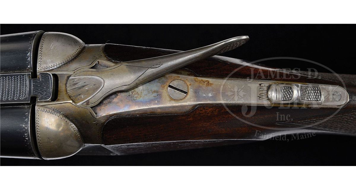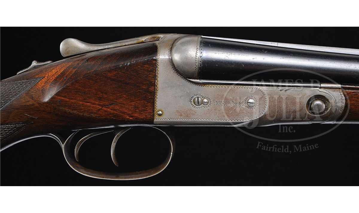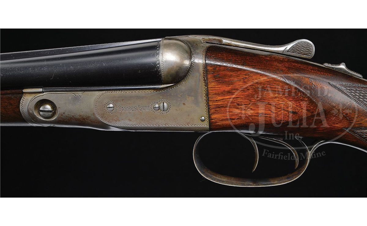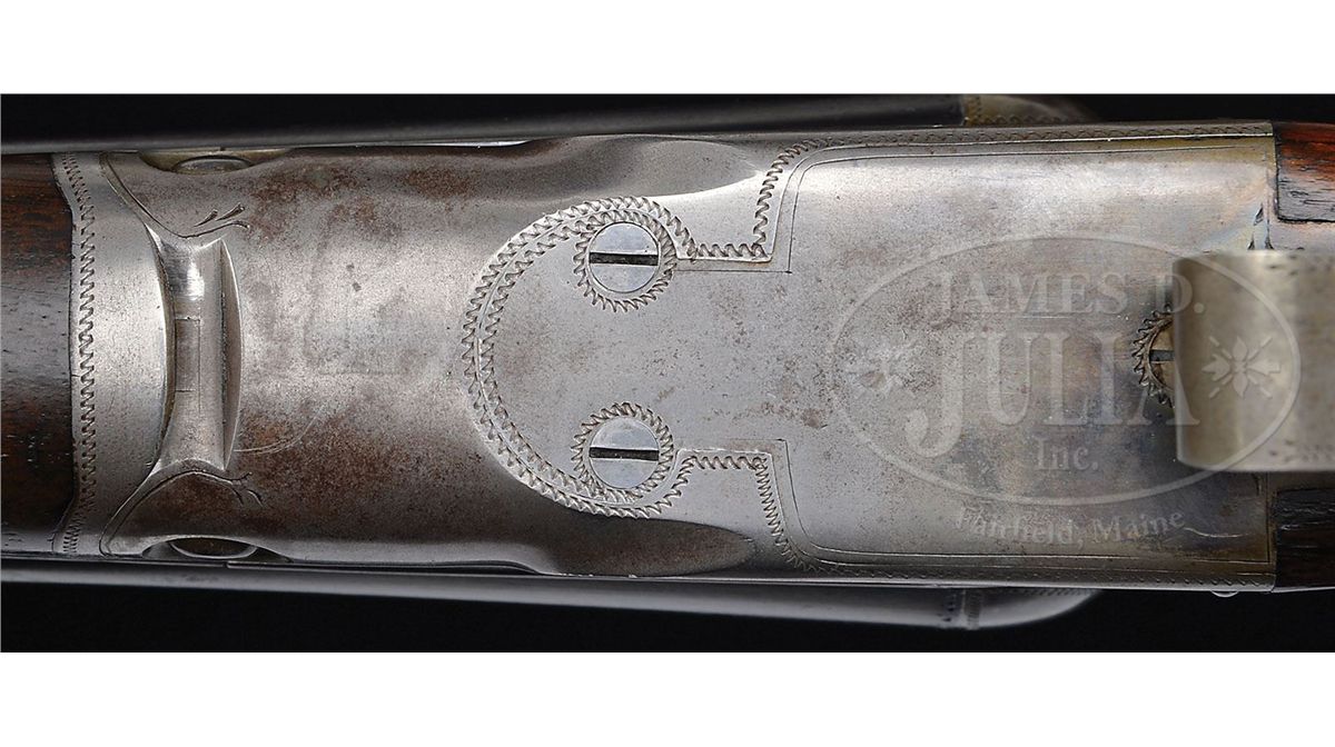 SN 149426. Cal. 28 ga. 2-3/4" Chambers. 0 Frame. 26" Bbls are marked with Parker name, address and "Vulcan Steel" on top of rib. Bbl flats have correct markings. Typical, correctly marked, "V" action features automatic safety and double triggers. Relatively plain American walnut capped pistol grip buttstock measures 14-1/4" over Parker dogs head buttplate with spur. Gun is fitted with standard splinter forend. Bore diameter: left-.555, right -.555. Bore restrictions: left -.025 (Full), right -.025 (Full). Wall thickness: left -.025, right -.030. Drop at heel: 2-13/16", drop at comb: 1-5/8". Weight: 6 lbs. 0 oz. LOP: 14-1/4". All specifications match those in factory letter which indicates that it was shipped to H. D. Folsom Arms Co. on Oct. 2, 1908. PROVENANCE: Factory letter. CONDITION: Very fine. Bbls retain over 90% orig blue, silvered on sharp edges and thinning at normal carry point. Action retains a considerable amount of orig case hardening color where protected, but is mostly pewter gray with some brown spotting. Screws are excellent. Stocks retain most of their orig varnish finish with a number of scratches and marks, a few fairly deep. Finish is worn through at grip and rear of forend from normal hand wear. Checkering is slightly worn. Bores are excellent. Action is tight. An early 28 bore that has not been molested. 4-49273 MGM119