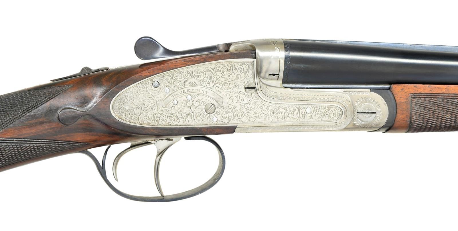 PARKEMY WITH EXTRA BARRELS AND CASE. Cal. 28 ga. 2 3/4". S# 79990. Two sets of chopperlump bbls., "1" measures 24 3/4", "2" measures 28", with slightly raised game ribs are gold inlaid "1" and "2" on breech ends. Bbl. flats are stamped with 1994 Spanish Nitro proofs for 2 3/4" chambers, both sets are choked IC and MOD. Case hardened sidelock action with hand detachable locks also features nonautomatic safety, bushed strikers, engraved line tumbler end cocking indicators and double triggers (front articulated). Action and lockplates are engraved with 90% coverage rolled on shaded scroll within small scroll borders. H&H style device on each lockplate is engraved "SILVERPOINT". Straight grip buttstock of nicely marbled European walnut measures 14 1/4" over checkered wood butt. Stock features drop points, point pattern grip checkering and vacant silver oval. Matching splinter ejector forend which services both bbl. sets has Anson release. MEASUREMENTS WITH BBL. SET "2": STOCK: DAH: 2 1/4". DAC: 1 1/4". LOP: 14 1/4". CAST: approx. 1/4" off. WEIGHT: 6 lb. 2 oz. UNATTACHED ACCESSORIES: gun is accompanied by a plastic carrying case with space for action and both bbl. sets. CONDITION: very fine, close to "as new". Appears to have been shot very little. There are only a few very minor handling marks and a few minor stains in all factory surfaces. Bright shiny bores. Mechanically good. (22-4535). MODERN. $4,000-6,000.