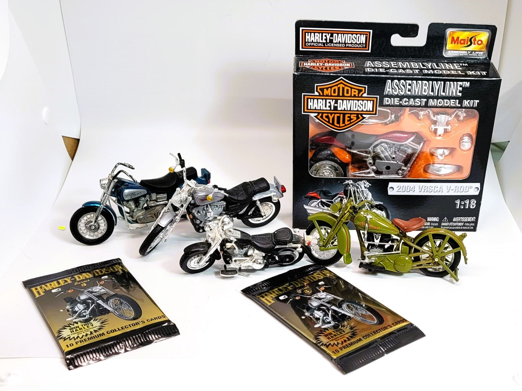 OF SERIES 3 CARDS (10 CARDS PER PACKAGE) 4 MINERATURE HARLEY DAVIDSON MOTORSCYCLES, 1 DIECAST MODEL KIT, 2004 VRSCA V-ROD, 1: 18 SCALE. COLLECTIBLES