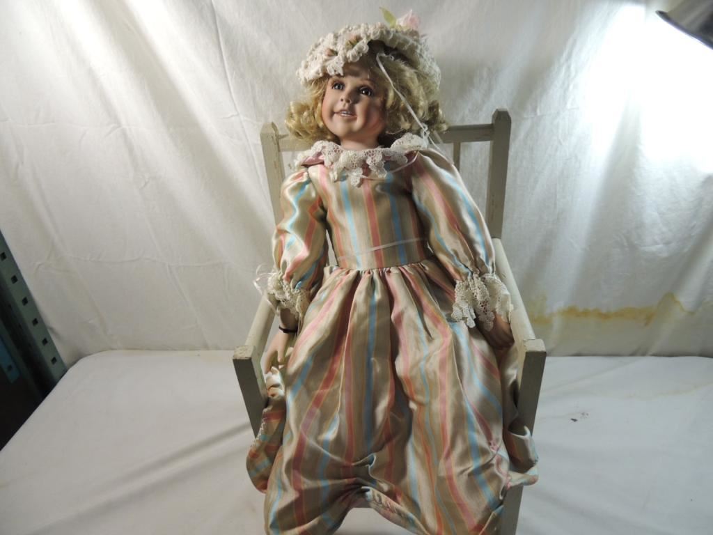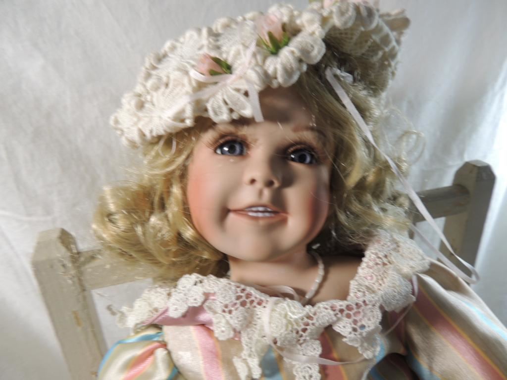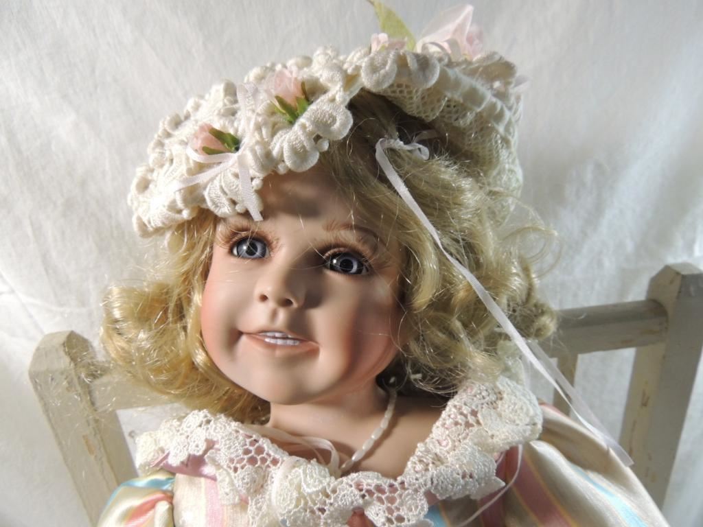 RETIRED DOLL, PARADISE GALLERY DOLLS BLONDE HAIR BLUE EYES, PORCELAIN DOLL, DECORATIVE, GOOD CONDITION, COLLECTIBLE, DESIGNER DOLL, AS SHOWN SEE PHOTO FOR MORE DETAILS.
