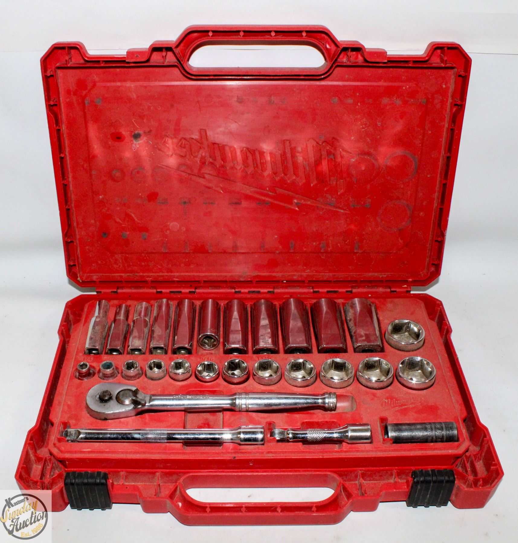 MAJORITY MILWAUKEE SOCKET SET WITH WESTWARD RATCHET, DEEP AND SHALLOW SOCKETS WITH EXTENSIONS IN EASY CARRY STORAGE CASE **ALL ITEMS MUST BE REMOVED BY 5PM SATURDAY, MAY 31ST 2025. ALL REMAINING ITEMS WILL BE SUBJECT TO A $6.00 PER DAY STORAGE CHARGE. ANY ITEMS REMAINING AFTER MONDAY, JUNE 16TH 2025 WILL BE CONSIDERED FORFEITED. NO REFUNDS WILL BE ISSUED FOR FORFEITED ITEMS. TO SCHEDULE A PICK UP APPOINTMENT CLICK HERE