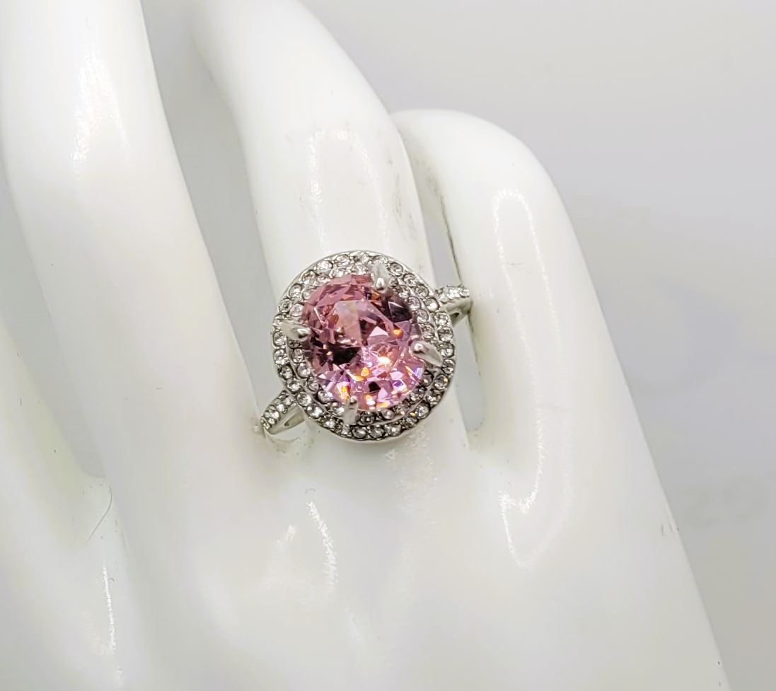 28) PIN & CLEAR CZ DOUBLE HALO RING, SIZE 8,