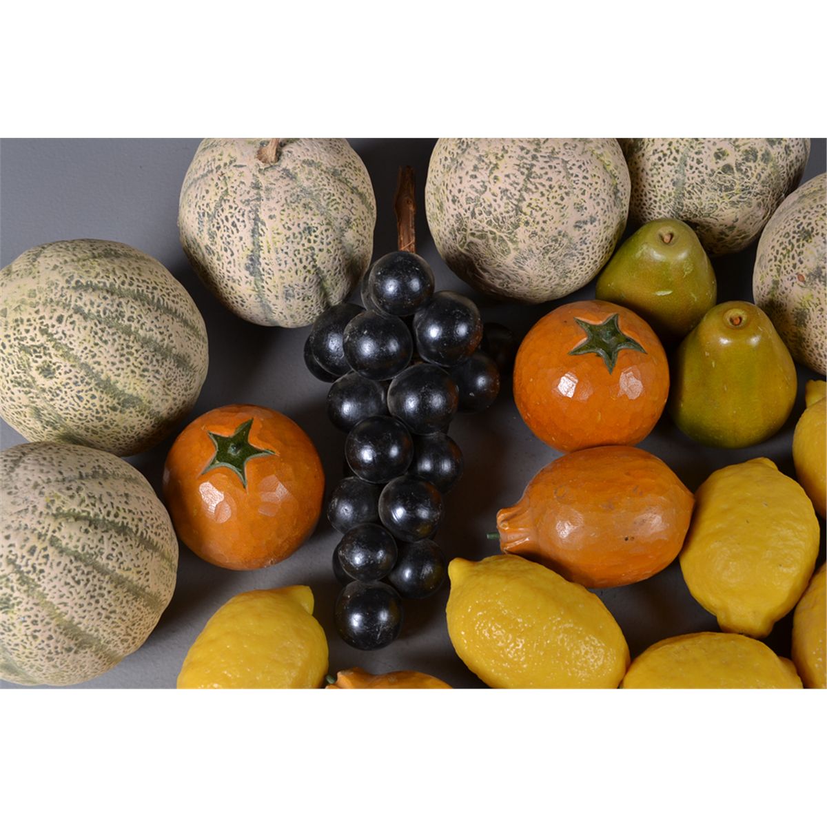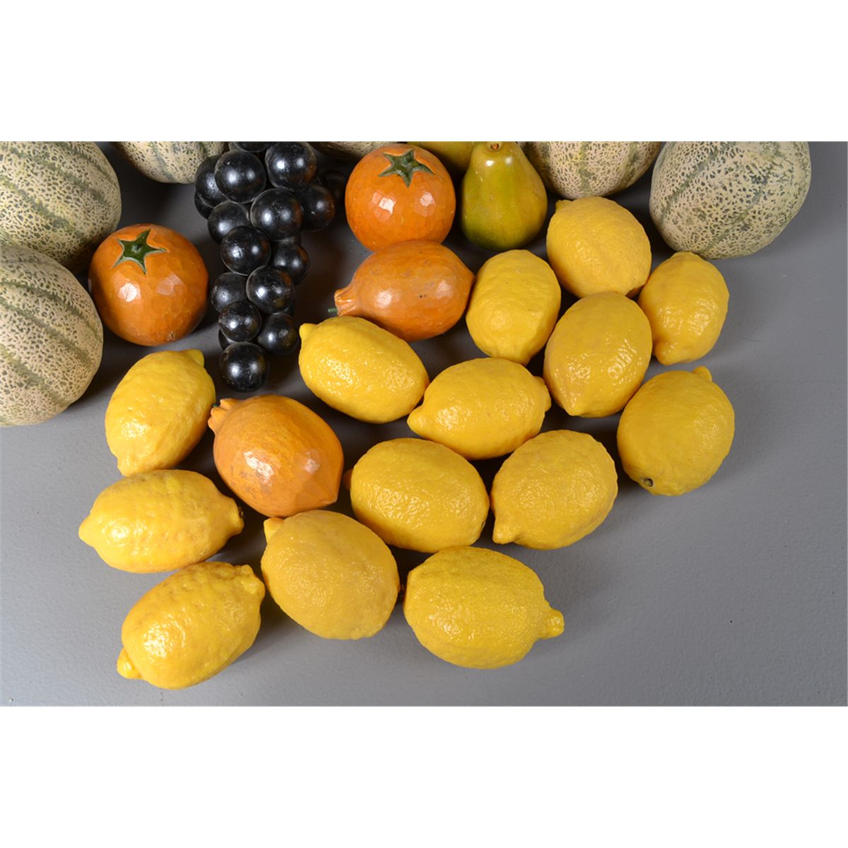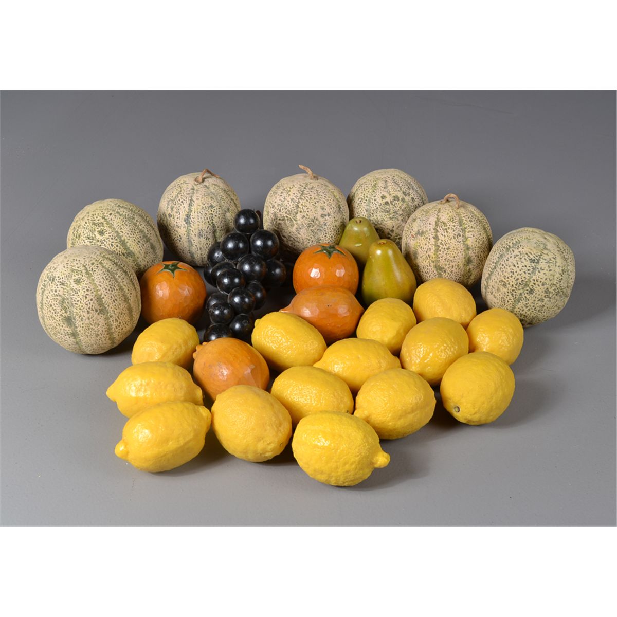 To include seven porcelain canteloupe, carved wood tomato, pear and grape examples, together with 14 composition lemons, longest measures 10.75". Early 20th century. Private collection Gregory, MI.