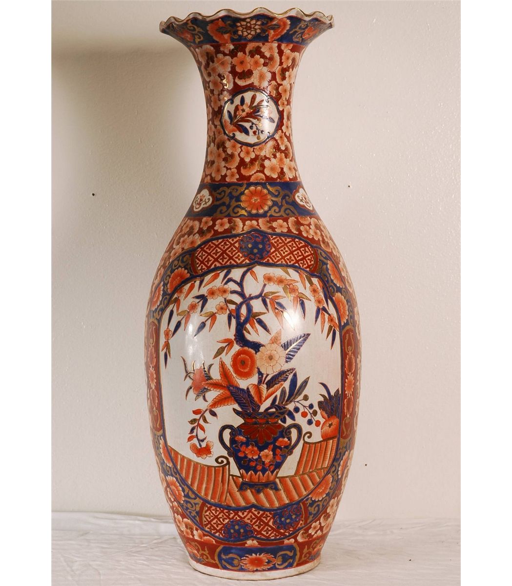 Royal blue, orange, red, white and gold paintings accent this vase in a floral asian design. 28"H opening 9" in diameter. No chips or cracks.
