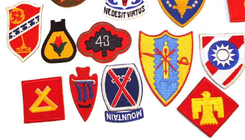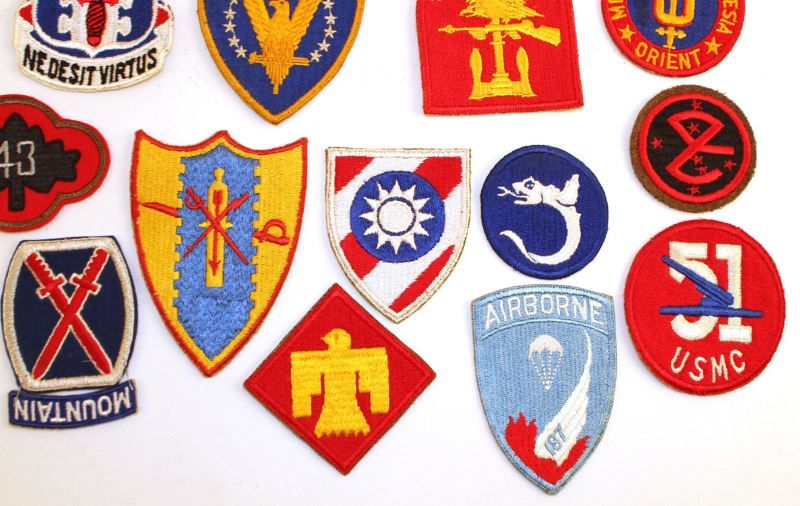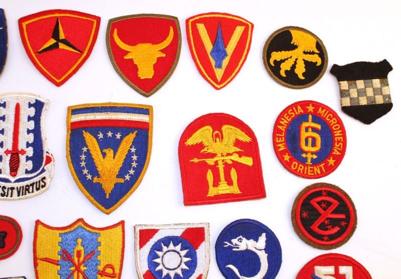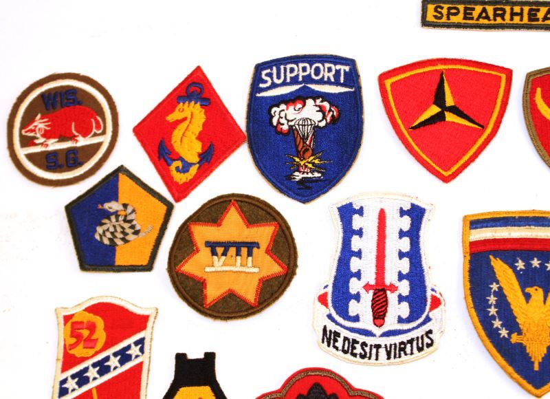 28 various WWII US Military patches, including 187th Airborne, VII Corps, USMC artillery, 6th Marine, 52 Defense Bat. 51st Infantry, 5th Marine, and more. All in very good condition. This lot has a reserve.