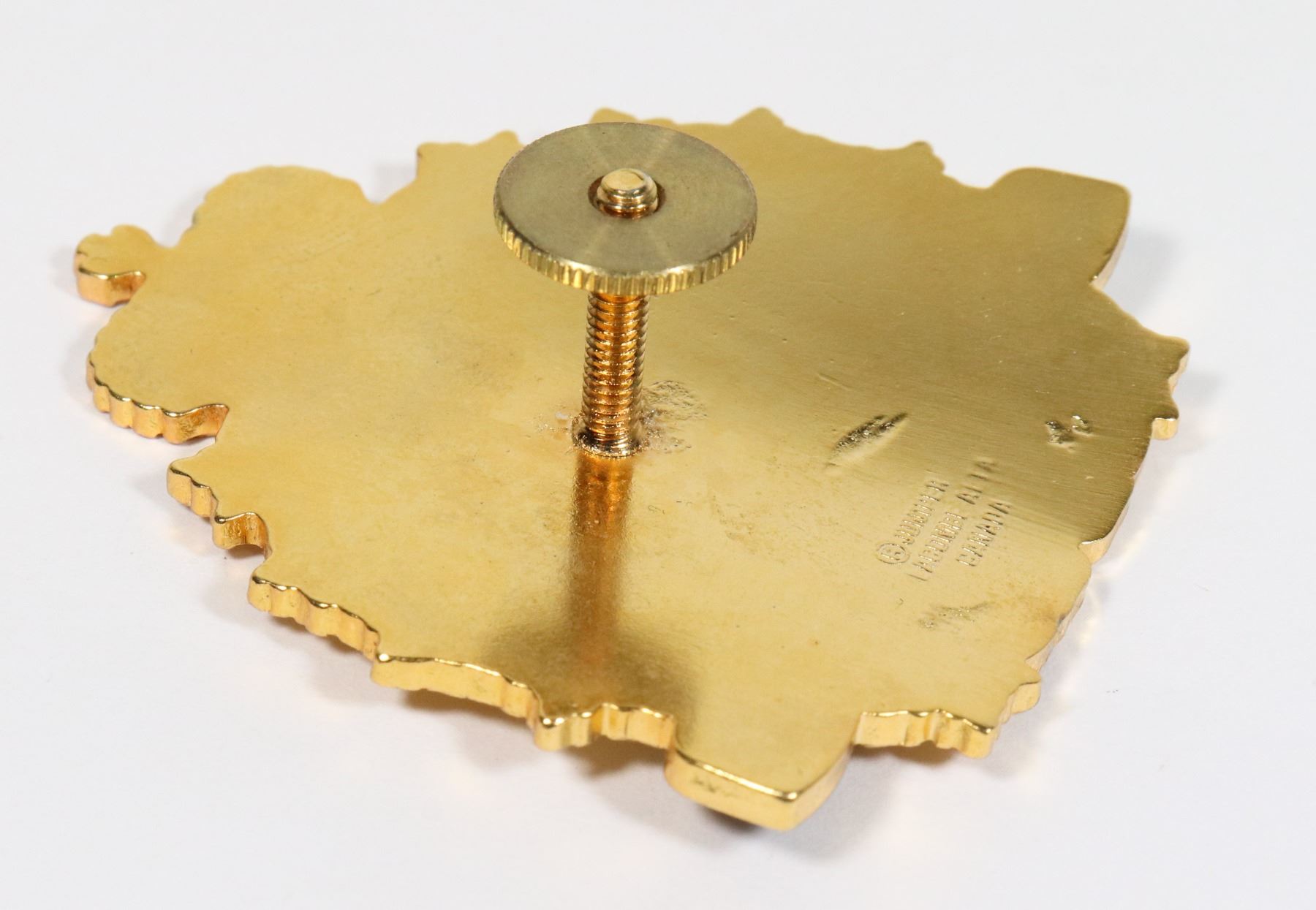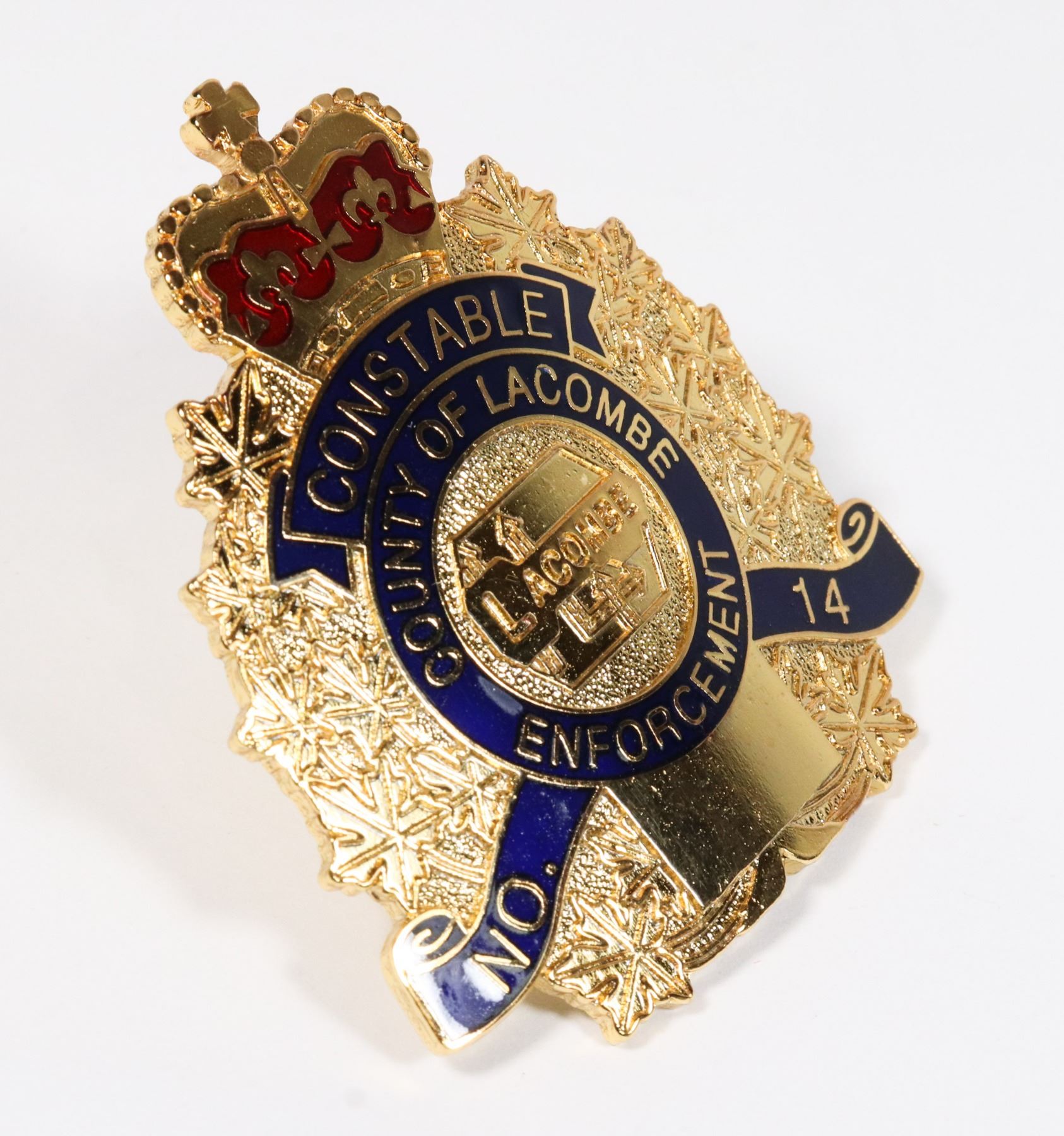 VARIATION LIGHT GOLD COLOUR VINTAGE CANADA CANADIAN POLICE LAW ENFORCEMENT CAP BADGE INSIGNIA MAKER MARKED JUNIPER LACOMBE ALBERTA ON REVERSE