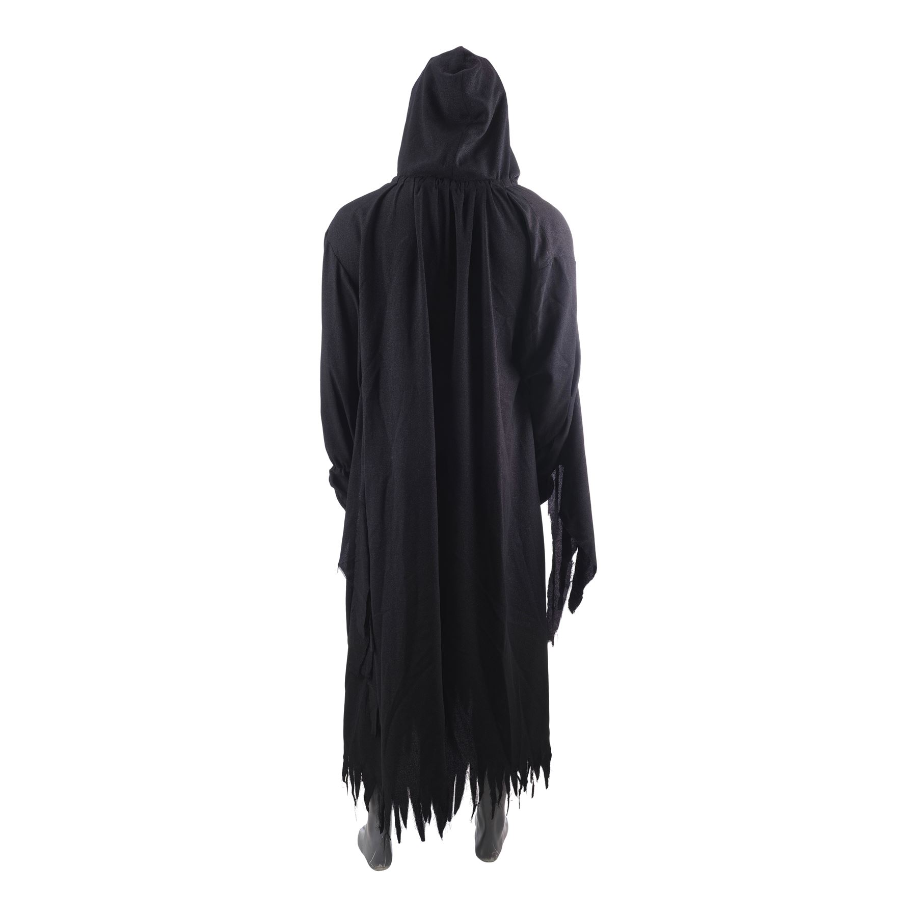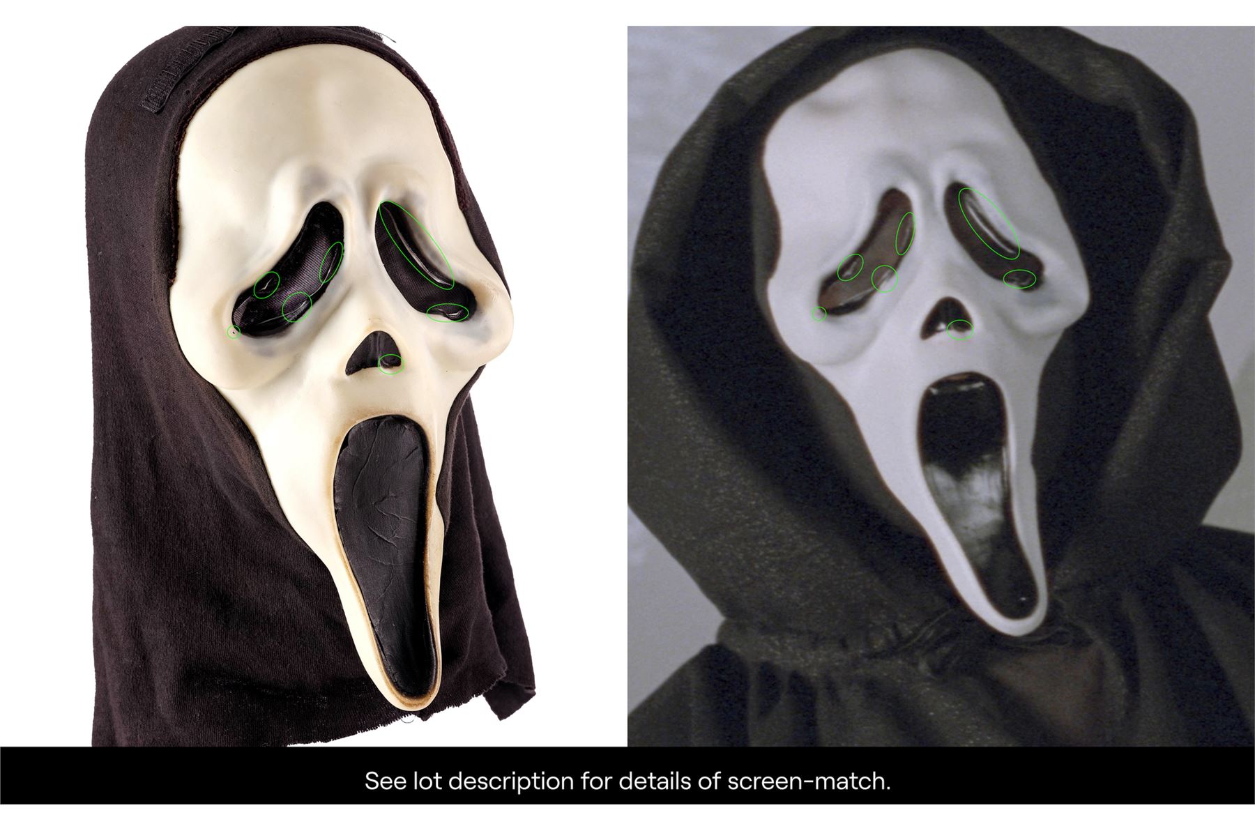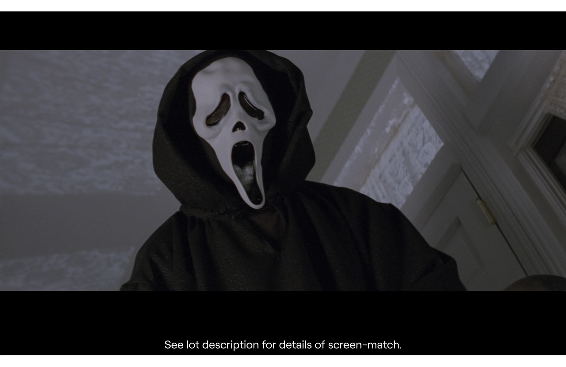 This iconic costume consists of one soft glow-in-the-dark PVC mask and a custom-made sparkly lurex robe with hood and built-in gloves. The mask was originally created by Fun World DIV for its Fantastic Faces/Fearsome Faces line. This mask has black mesh covered eyes, a blackened mouth and nose, and features the "Fun World Div" debossed on the backside of the long chin. Additionally the mouth features matte black tape, a temporary modification which was utilized by Peter Deming, a director of photography, for scenes in which the mouth needed to appear dull, whereas when the mouth needed to appear shiny they applied a layer of chapstick. The presence of the tape indicates the mask was last used in a scene where it needed a dull mouth. Attached to the mask is a black cotton shroud with a self-adhesive strip sewn into the top to secure the robe's hood, which has the second strip sewn onto the interior. The pull-over robe has a one-piece front and is made of a unique woven fabric which contains silver-colored threads to give the appearance of sparkles. The sparkles ultimately helped to visually distinguish the costume from dark backgrounds and was unique to the early Scream films. Furthermore, this robe features a smaller hood that contains a rigid plastic board sewn in to keep the shape of the crown, two tie strings at the neck, and a pair of gloves attached to the sleeves with a pinched back to give them a slimmer fit. The sleeves feature a more square shape with zig-zagged edges. This costume exhibits a buildup of grime and discoloration on the mask, while the robe exhibits frayed threads from unfinished edges.