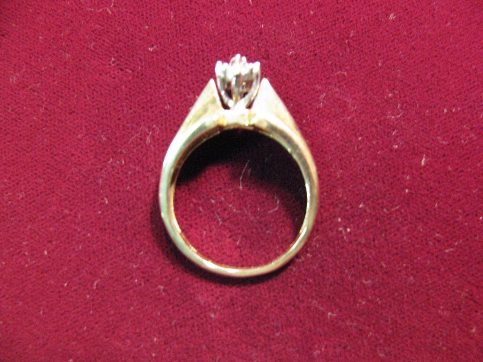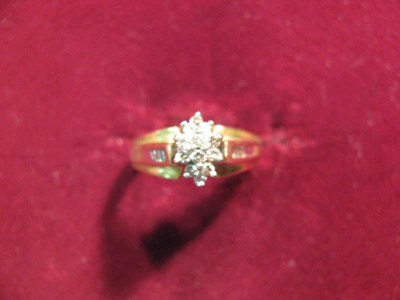2802. 10Kt Gold Diamond Cluster Ring With Baguette Diamonds On Sides, 20 Total, Lady's Size 6 1/2 Ring,Like New.