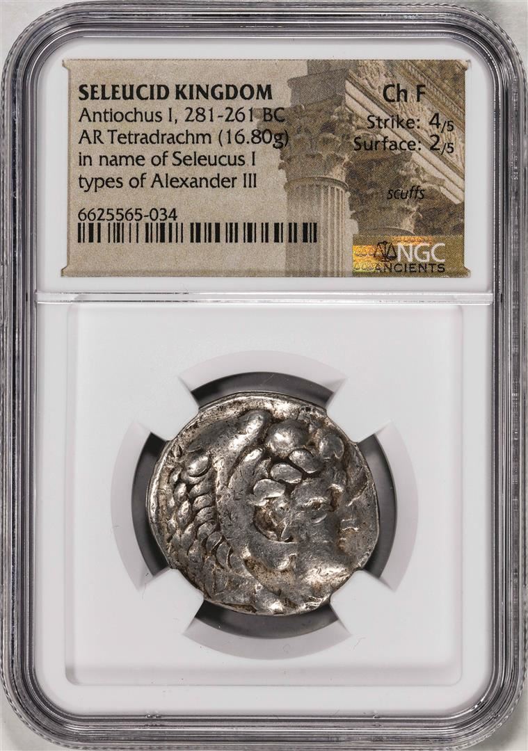 One 281-261 BC Seleucid Kingdom Antiochus I AR Tetradrachm Alexander III Ancient Coin NGC Ch F. NGC Certified.