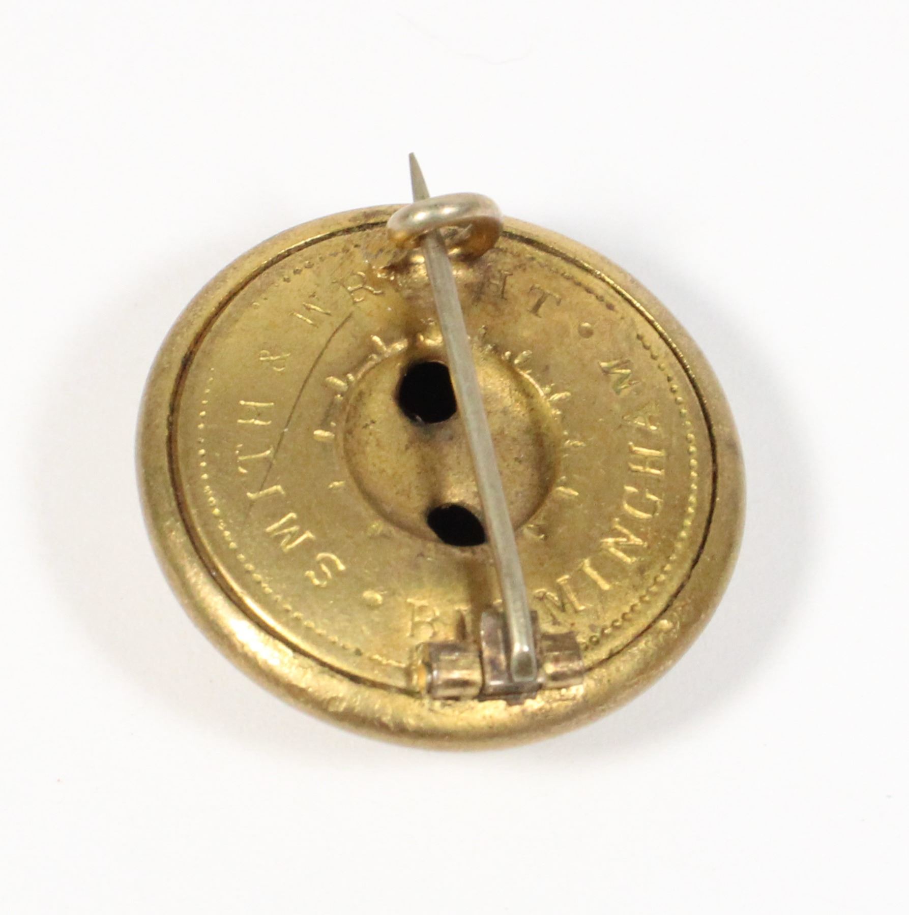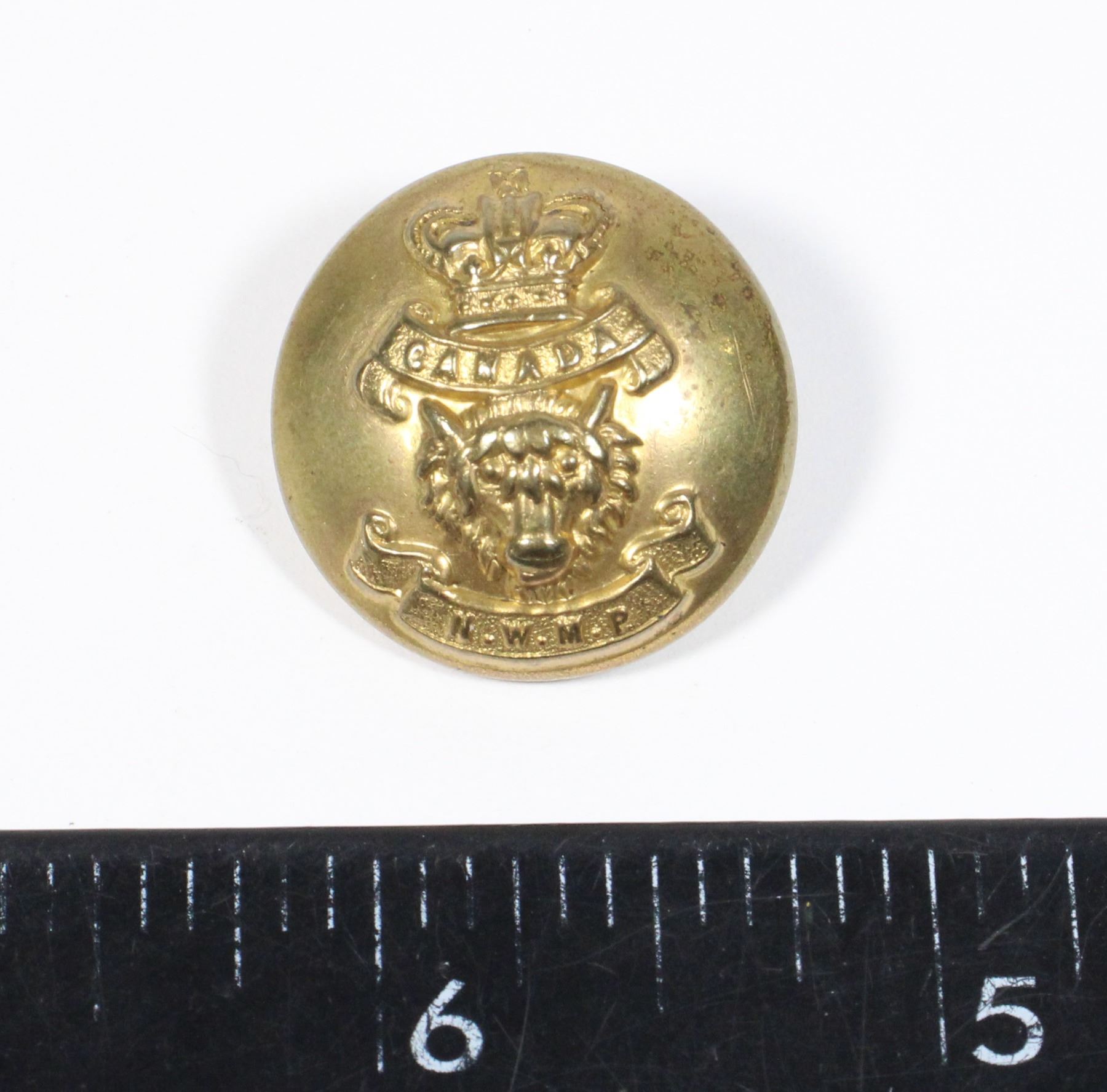 LARGE SIZE NWMP BUTTON, BRIGHT PATINA- REVERSE MARKED "SMITH & WRIGHT BIRMINGHAM" - CONVERTED FROM BUTTON TO SWEETHEART PIN BROACH WITH COMPLETE WORKING PIN AND FASTENER. EARLY CANADIAN POLICING 1873-1901 NORTH WEST MOUNTED POLICE