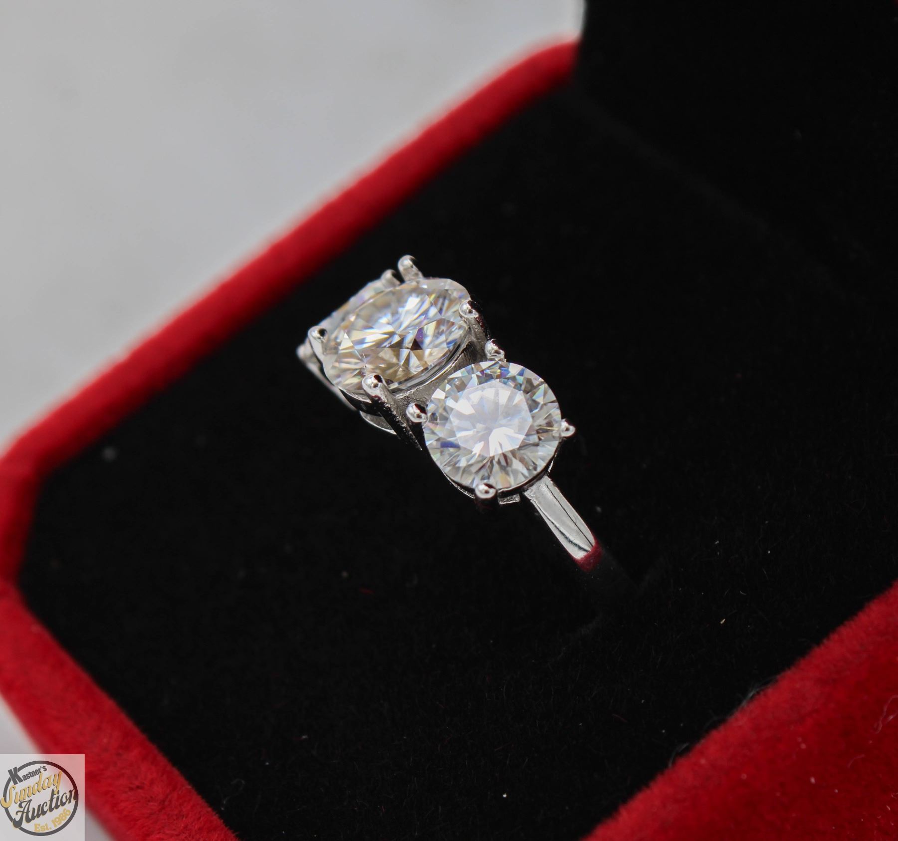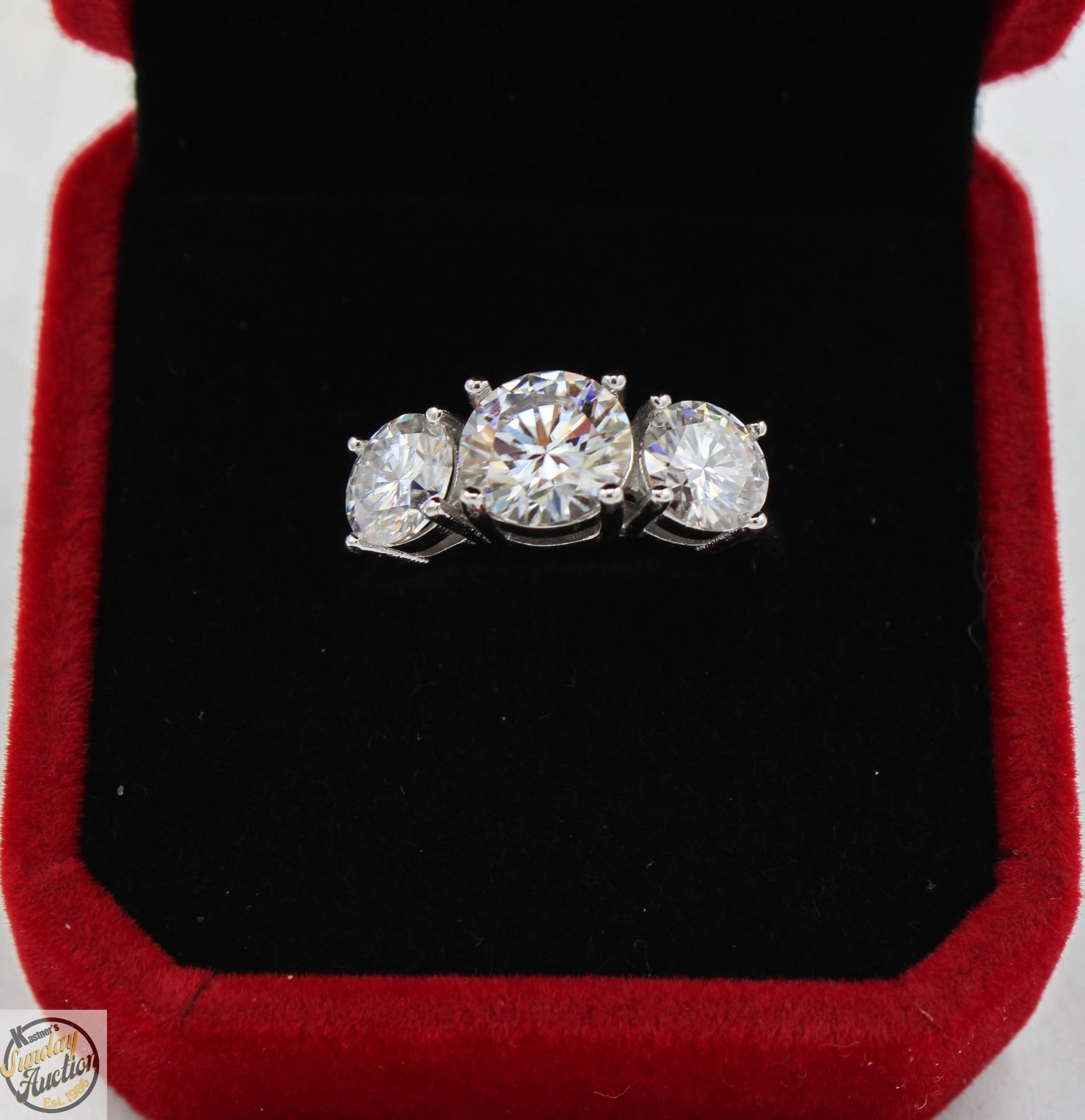BRILLIANT CUT MOISSANITE STONES VVS D COLOR SET WITH 2.00 CT MOISSANITE SET IN CENTER WITH 1.00 CT SET ON EITHER SIDE SET IN 925 SILVER RING SIZE 7 RETAIL VALUE $1,100.00 **ALL ITEMS MUST BE REMOVED BY 5PM SATURDAY, JULY 5TH 2025. ALL REMAINING ITEMS WILL BE SUBJECT TO A $6.00 PER DAY STORAGE CHARGE. ANY ITEMS REMAINING AFTER MONDAY, JULY 21ST 2025 WILL BE CONSIDERED FORFEITED. NO REFUNDS WILL BE ISSUED FOR FORFEITED ITEMS. TO SCHEDULE A PICK UP APPOINTMENT CLICK HERE
